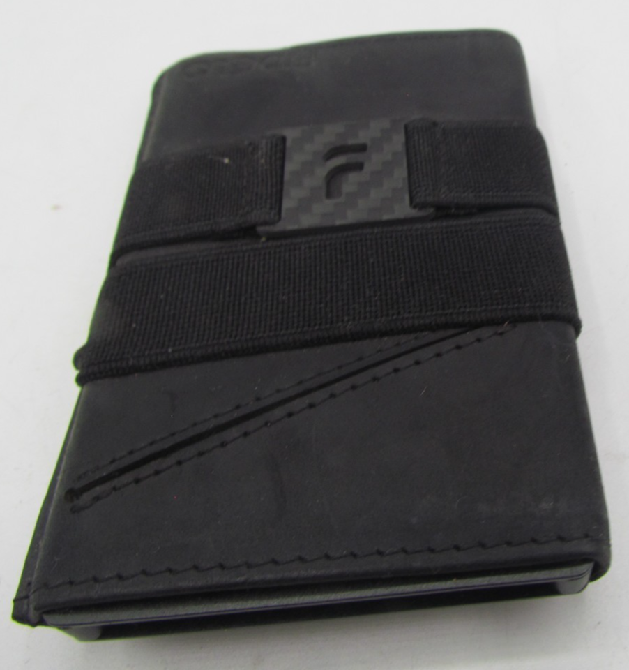 The Fidelo Minimalist Wallet for Men is a sleek and stylish credit card holder made of black aluminum. Featuring a pop-up design, this wallet is perfect for men looking for a slim and secure way to carry their vital cards. The brand's logo accents add a touch of sophistication to this essential accessory.