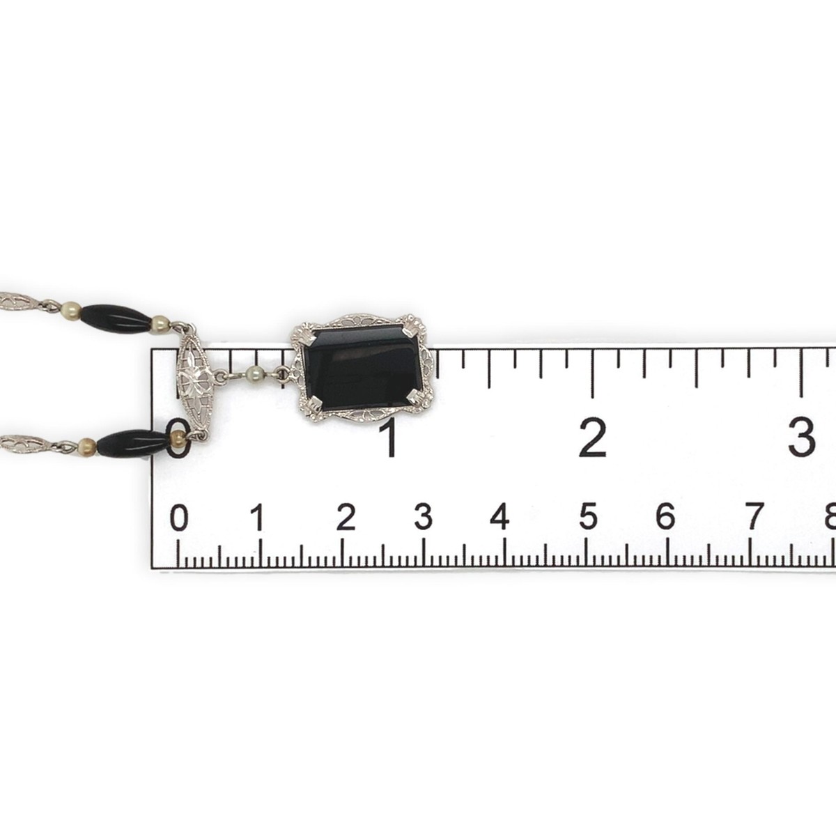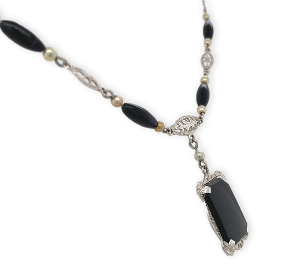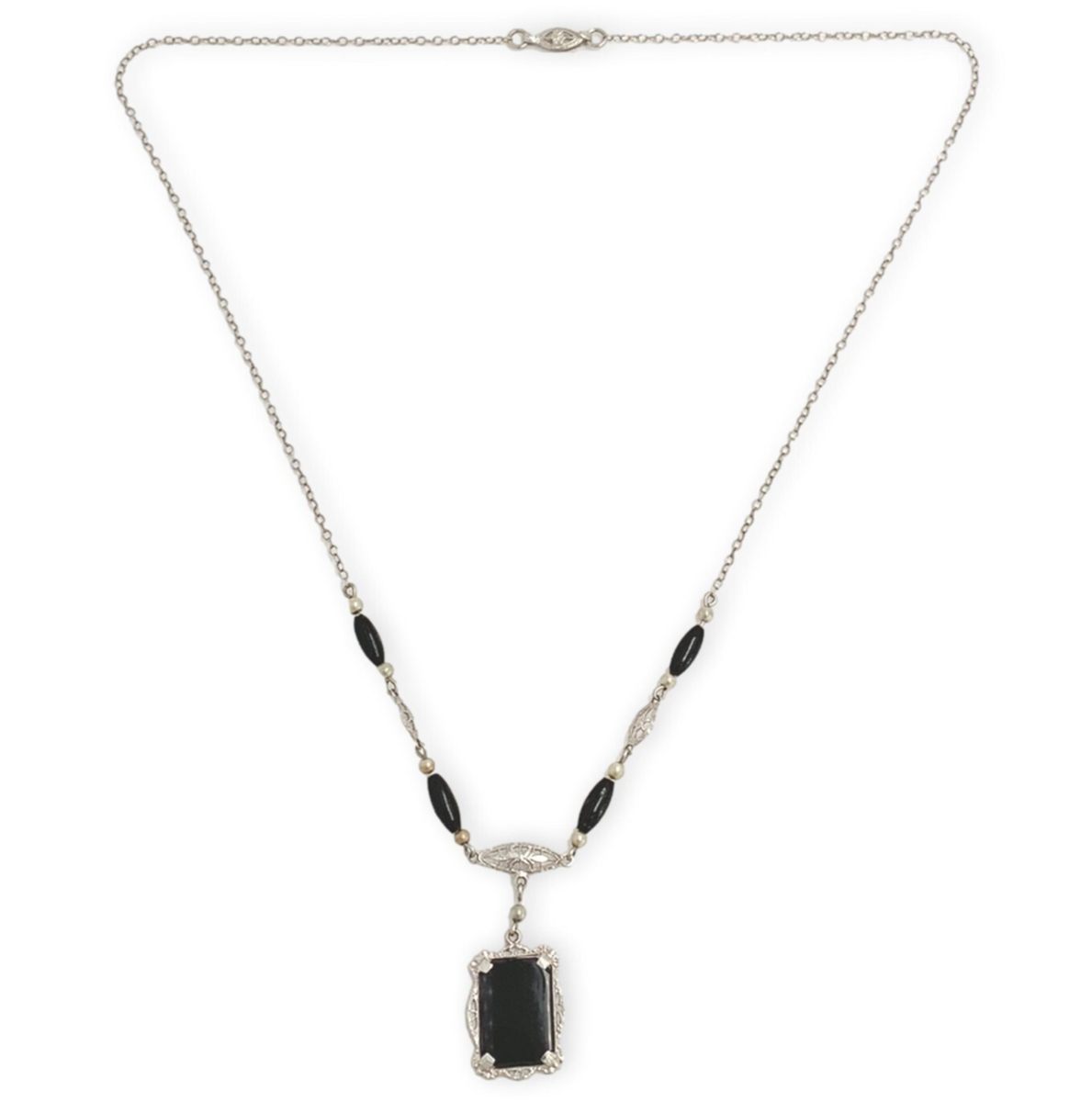Art Deco 10k white gold filigree pendant featuring a rectangular black onyx panel. The onyx measures about 14mm x 10mm. The pendant measures 1 1/4" long with filigree bail and has an attached original chain; wearable length is 16 5/8". There are nine small faux pearl accent beads and four oval black onyx beads. The necklace weighs 1.92 dwt., and dates from the 1920-40s. Gorgeous!