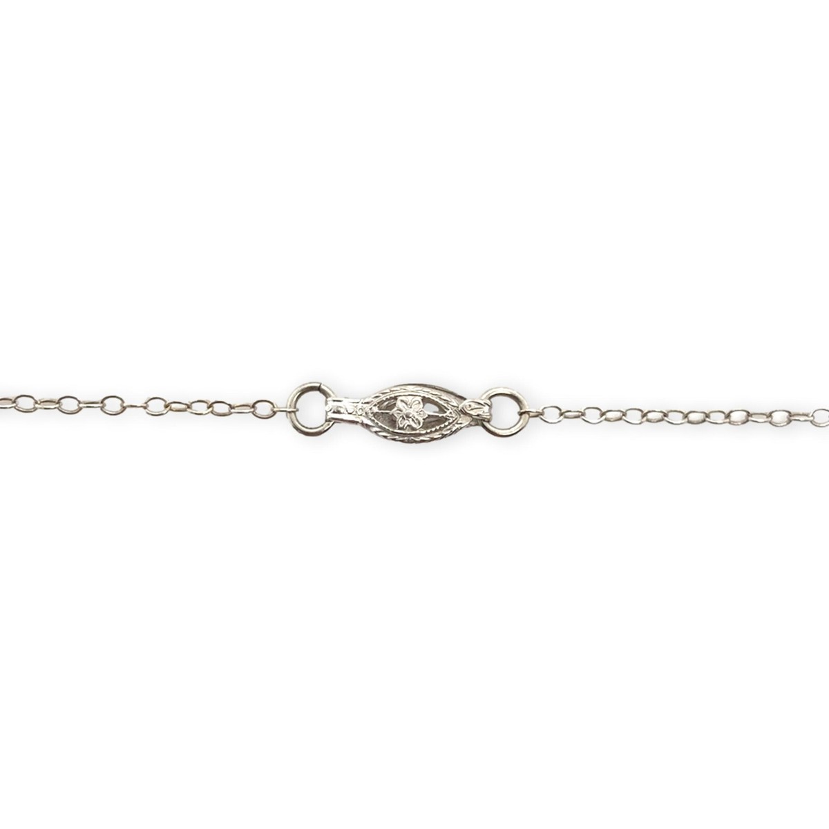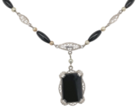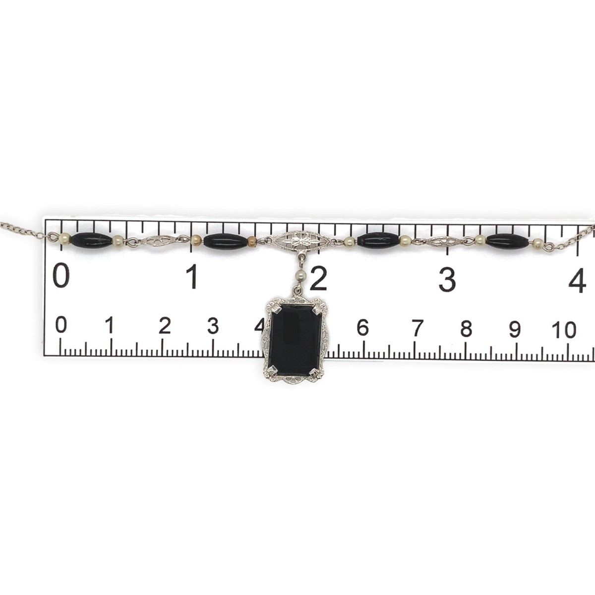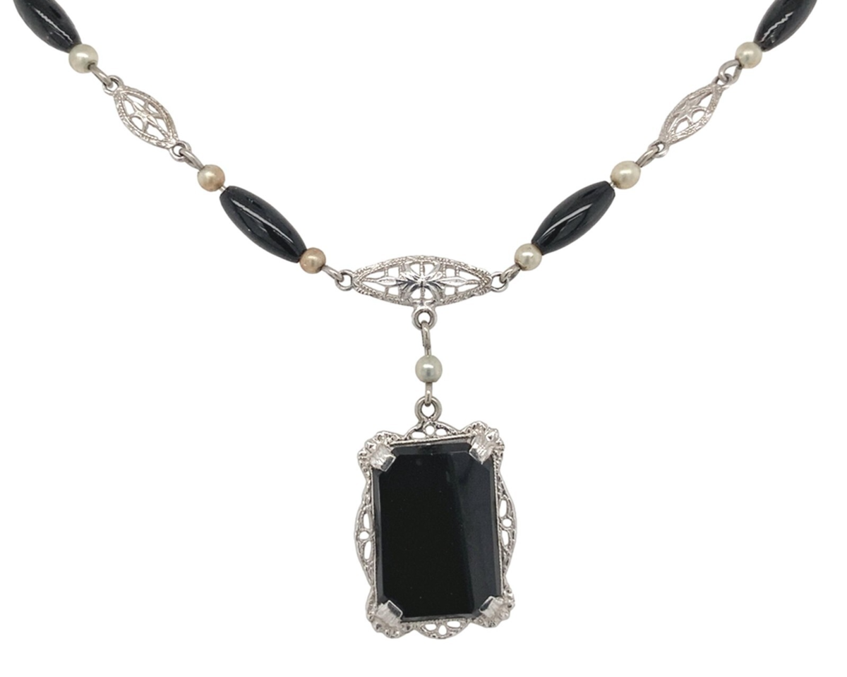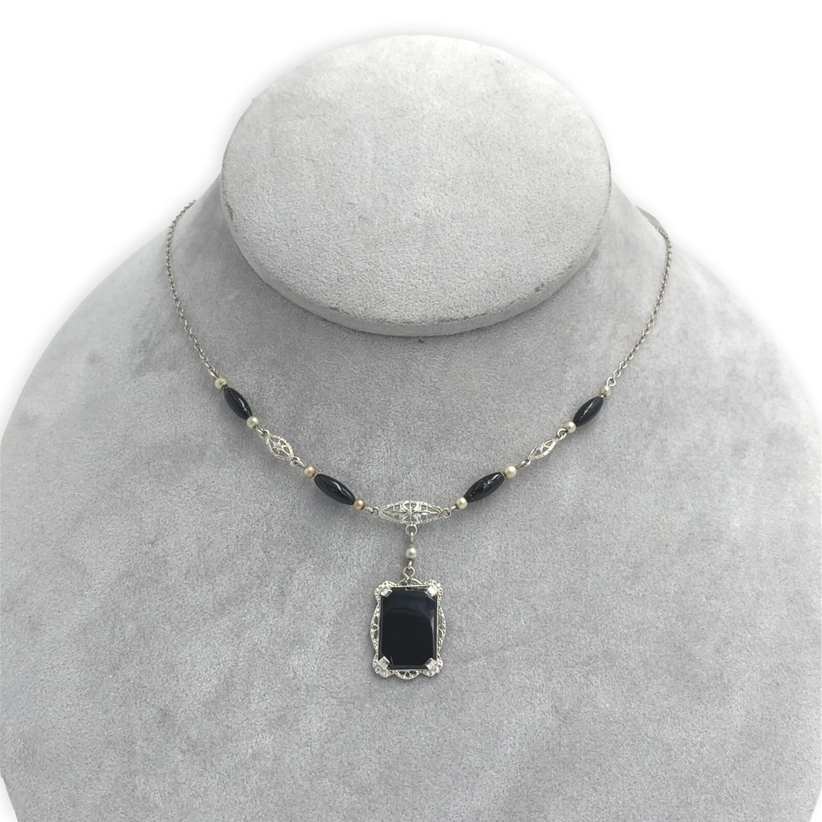 Art Deco 10k white gold filigree pendant featuring a rectangular black onyx panel. The onyx measures about 14mm x 10mm. The pendant measures 1 1/4" long with filigree bail and has an attached original chain; wearable length is 16 5/8". There are nine small faux pearl accent beads and four oval black onyx beads. The necklace weighs 1.92 dwt., and dates from the 1920-40s. Gorgeous!