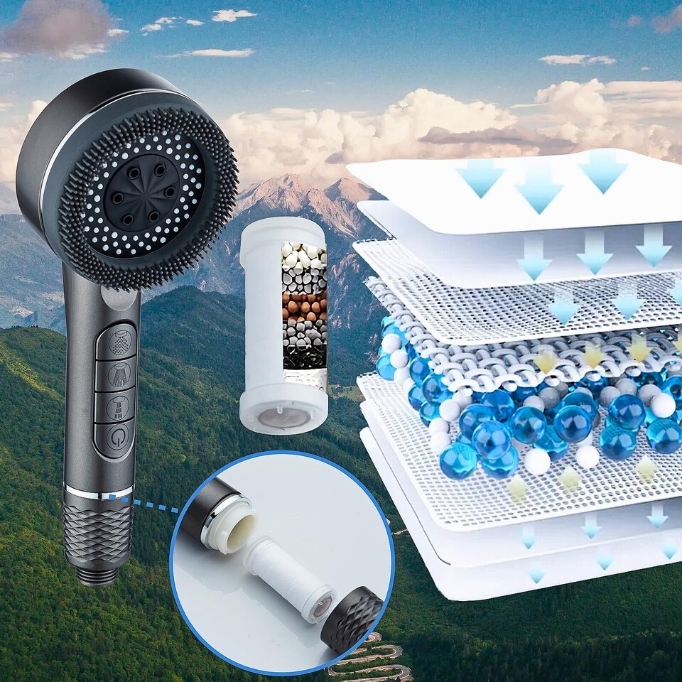 Upgraded Filtered ShowerheadThis filtered shower head eliminates 99.99% of chlorine, reducing skin and hair dryness and irritation. It also includes a filter system that filters out various impurities, offering a refreshing and clean shower experience. Additionally, we provide 2 replaceable filter elements as product accessories for easy maintenance.