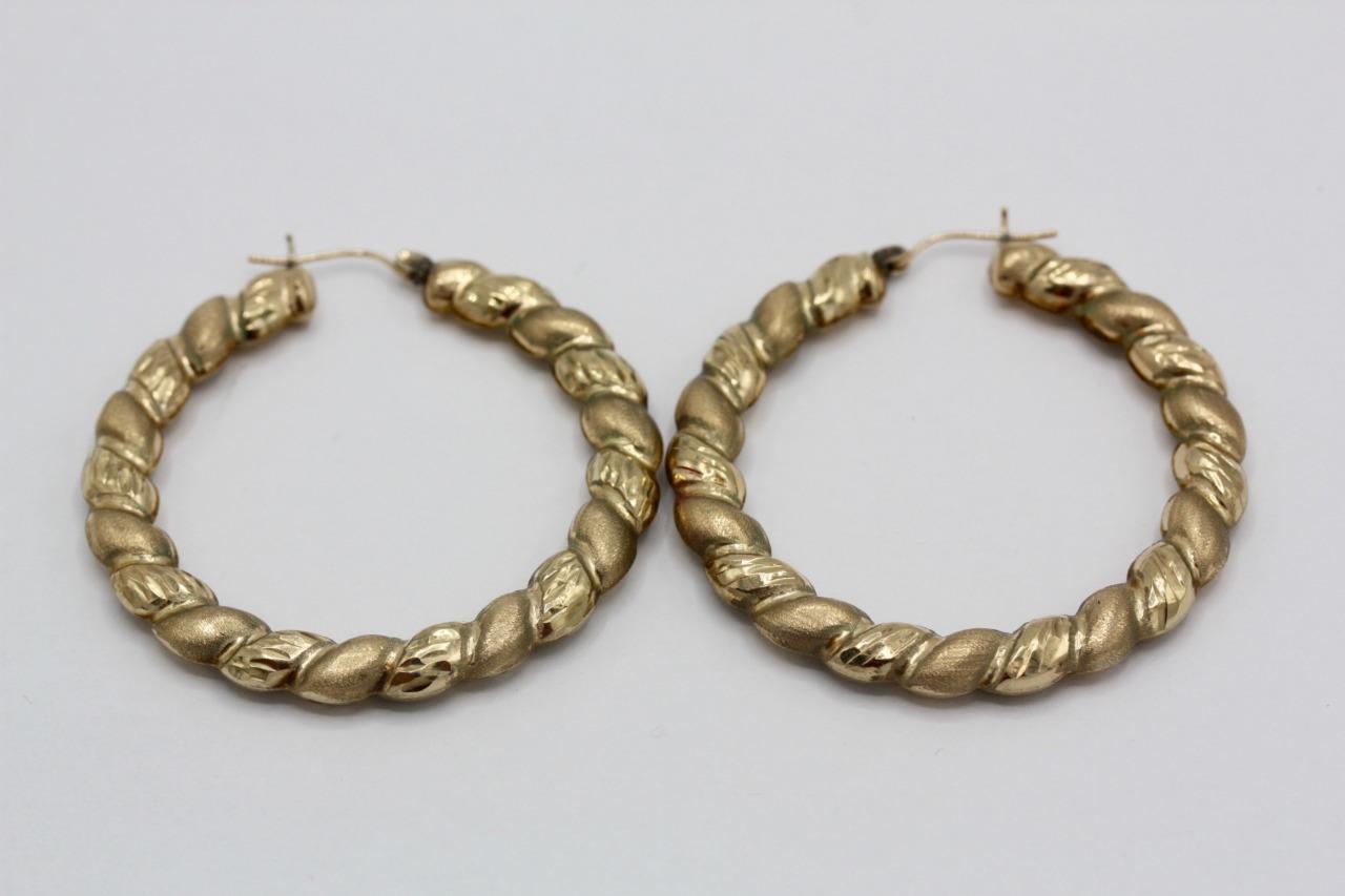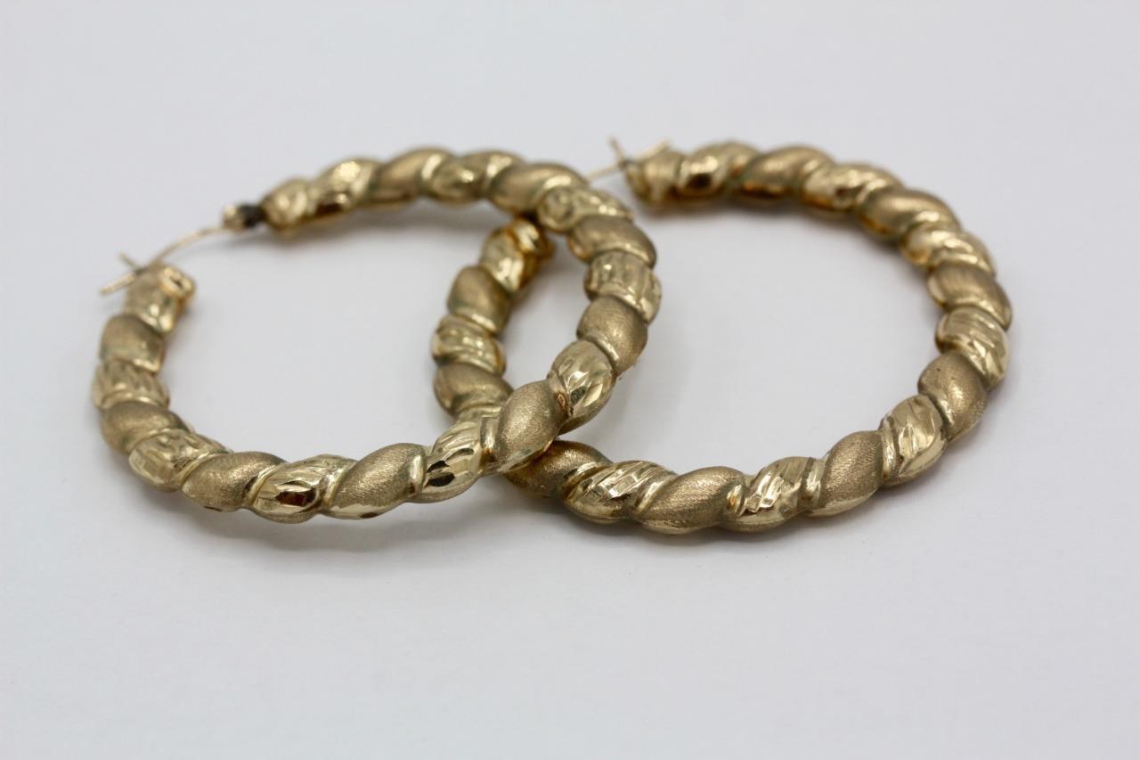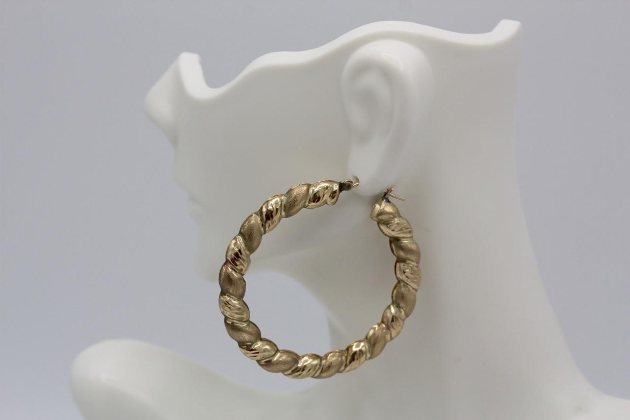 - Fine 10K Yellow Gold Satin Finish Diamond Cut Design Twist Hoop Earrings 50MM