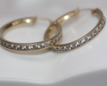 - Fine 14K Yellow Gold Channel Set Clear Stone Hoop Earrings 30mm 6.7 Grams