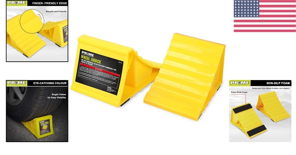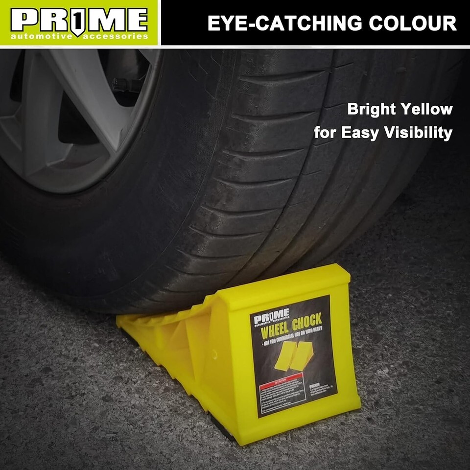 Experience unparalleled stability and safety with our Finger-Friendly PR1ME Wheel Chocks. Constructed from durable materials, these chocks are perfect for tires up to 26" in diameter and designed to prevent slipping when parked. The bright yellow color ensures that they are always easy to locate, making your parking experience hassle-free. With smooth edges for your protection, these wheel chocks are not only effective but also user-friendly.