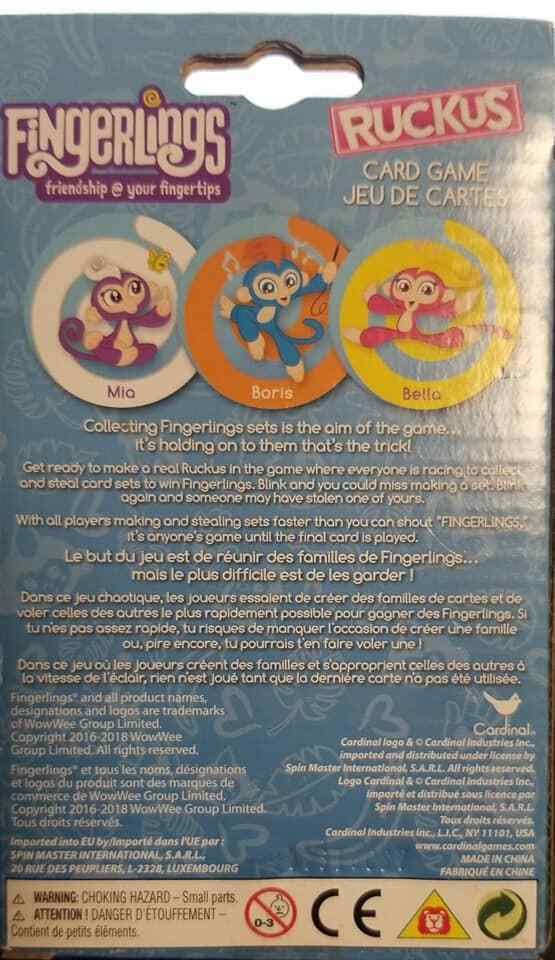 Get ready to make a real Ruckus in the game where everyone is racing to collect steal card sets to win Fingerlings! See it. Match it. Steal it! With all the players making stealing sets faster than you can shout ?Fingerling? it?s anyone?s game until the final card is played. Comes with a bonus Fingerlings figure! A fun and exciting game