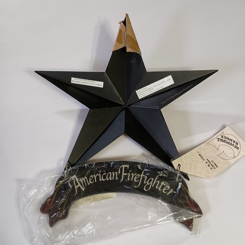 The Firefighter Star Wall Hanging is a 12" metal star with a multicolor painted design featuring a flame theme. This decorative piece is perfect for any room in the house, with a hanging style that adds a unique touch to the space. The star shape and character family of firefighters make it a meaningful and patriotic addition to the home decor, celebrating duty honor courage and American Firefighter. Normal wear. Sizes are approximate.