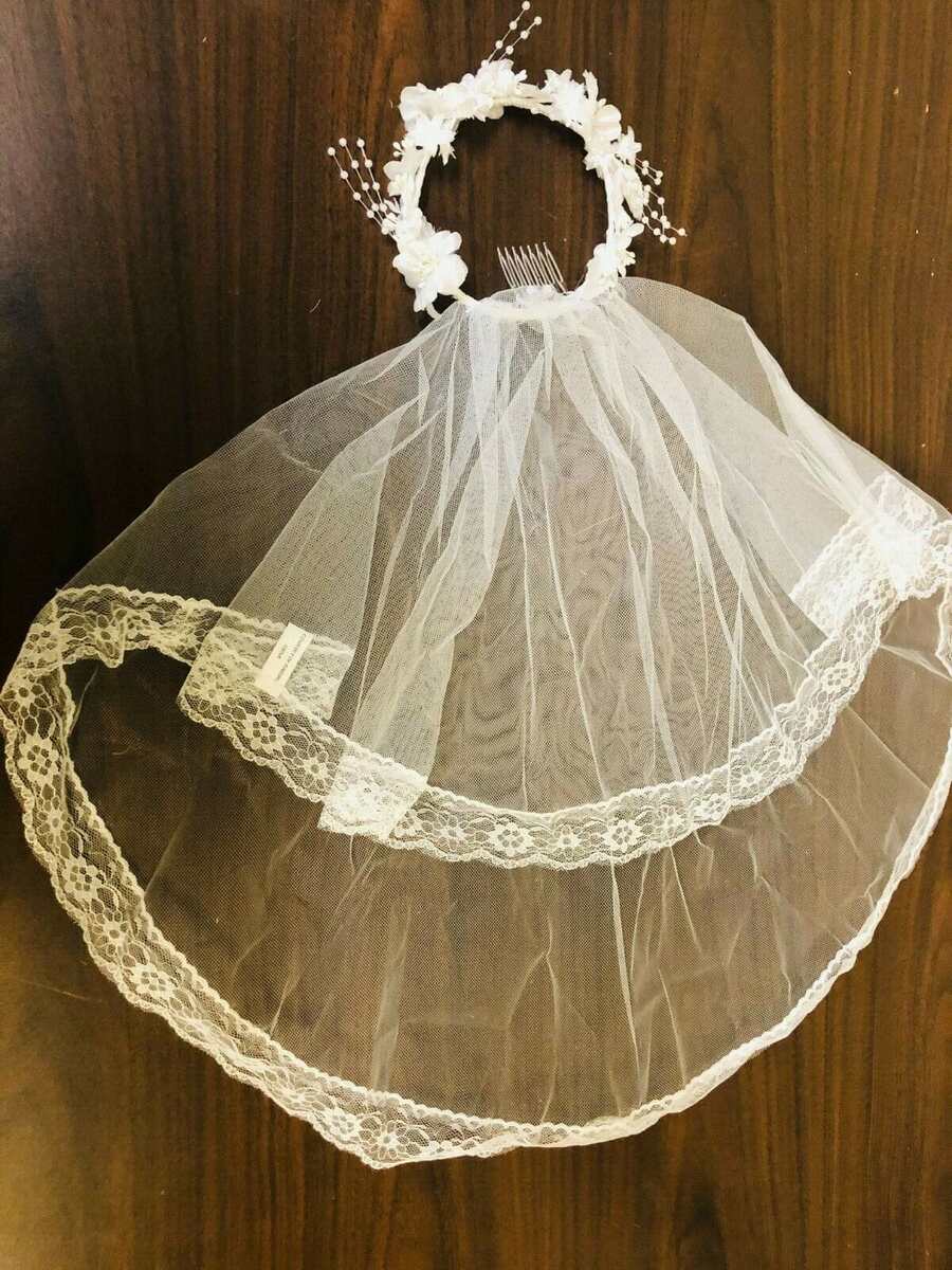 You are purchasing a beautiful first holy communion with a floral headband veil. Made of nylon mesh with a tiara made of silk florals. This will complement that special day. The measurement of the veil is approx. 19" long. It comes with it's own box for save keeping. Please see the pictures for details.