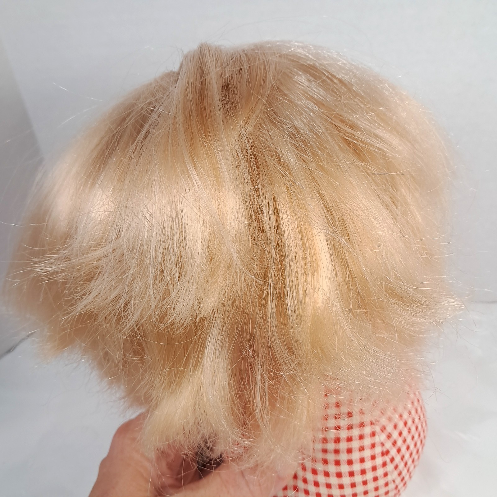 Some discoloration to the outfit and hair could use a bit more work if desired. From 1973. Good vintage condition. Red plaid outfit with white apron