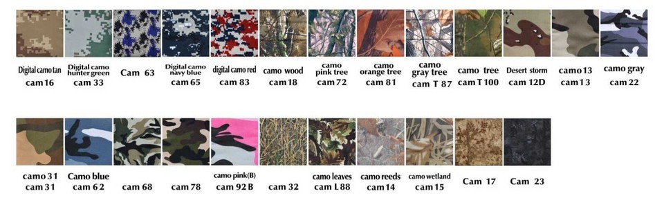 We have a picture of all available colors in cotton and camouflage designs.