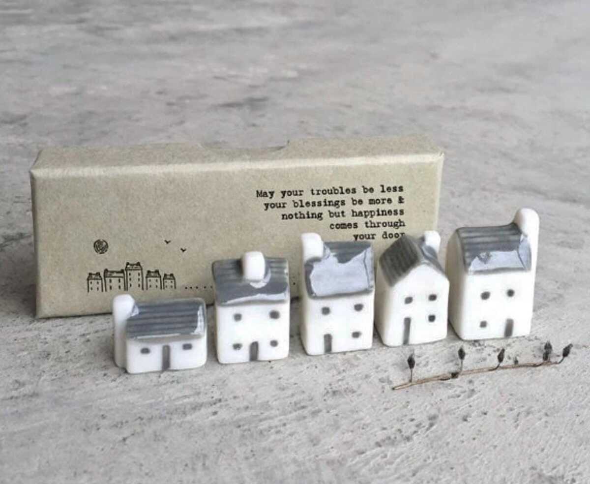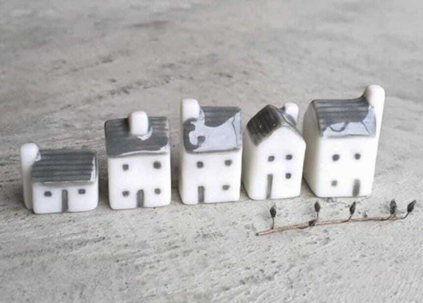 Made from porcelain with a smooth finish, this set of five houses are all different shapes and sizes.