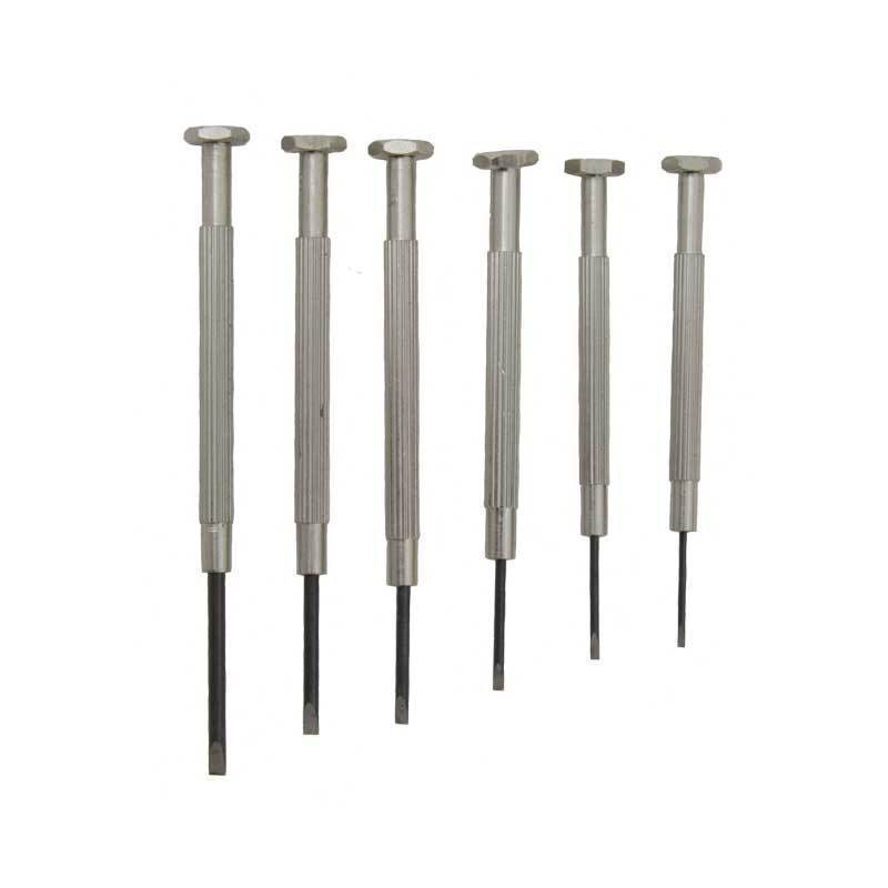 Six piece miniature screwdriver set Blades are not replaceable Sizes include: 1.00, 1.20, 1.40, 1.60, 2.00 and 2.30mm Supplied in wood box