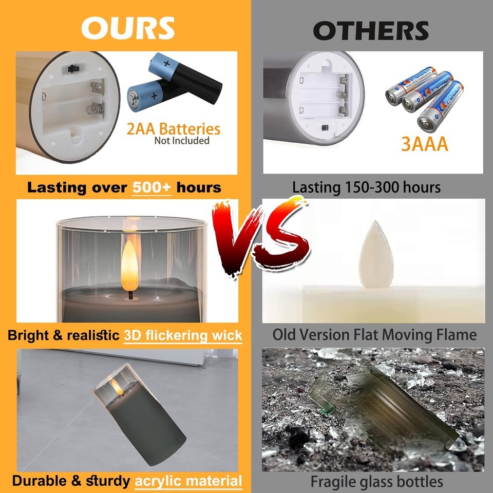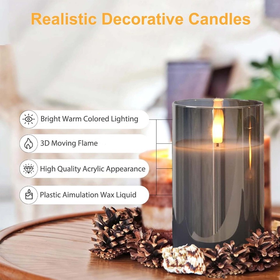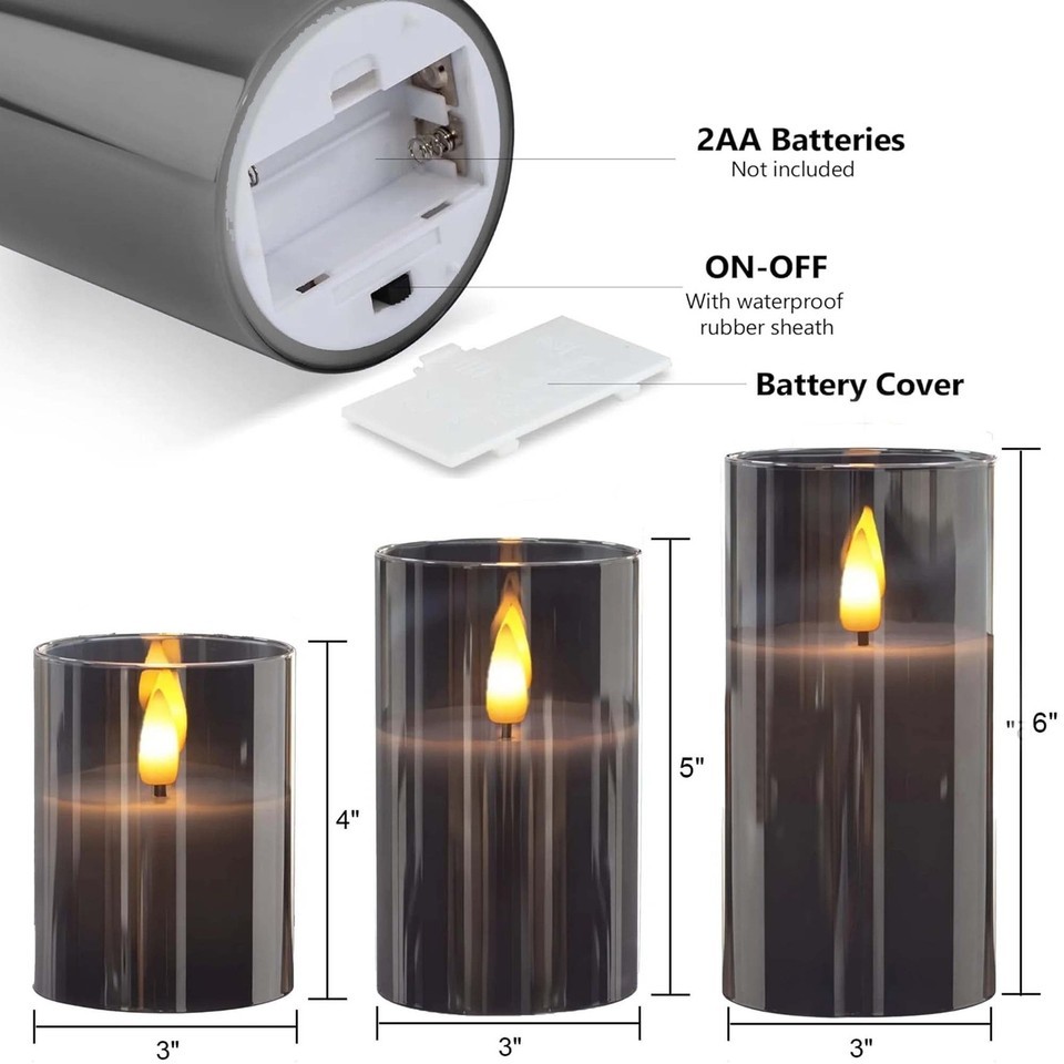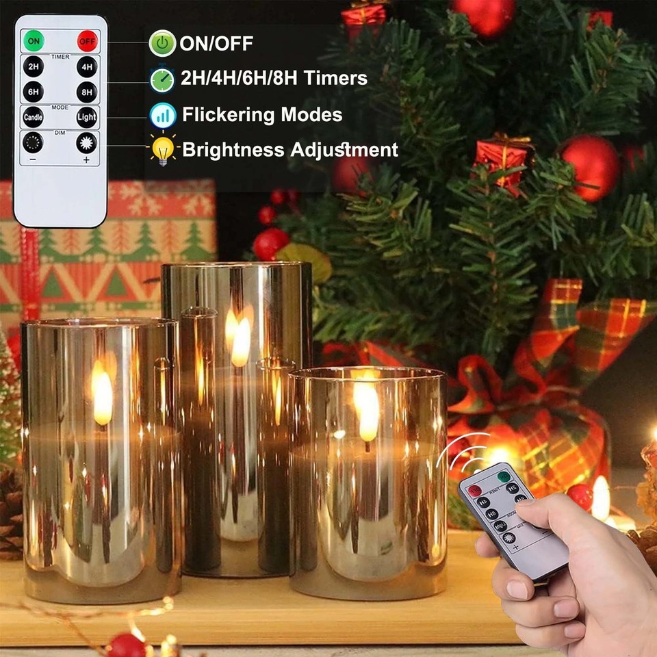 ??HIGH QUALITY UNBREAKABLE ELECTRIC CANDLES 3D WICK FLIKER?: Crafted with an acrylic shell, made of a LED light inside. These flickering flameless candles offer the beauty of traditional candles without the risk of an open flame. A warm white glow reflects well, add a inviting atmosphere. ??BRIGHT REALISTIC?: Our battery powered flameless candles emulate the look of real candles, The soft flicker of candles simulates the most realistic traditional combustion effect, brings the most realistic experience to users. ??100% SAFE NO MESS?: Lifelike look while unscented, flameless, smokeless, windproof, dripless, no fire risk, especially friendly for family having naughty kids or pets, great decor and gifts. ??BATTERY POWERED, POWERFUL LEDS LONG LASTING?: Each led pillar candle is powered by 2 AA batteries ( not included), lasting over 550 hours, while the lifetime of the led lamps is up to 50,000 hours. Unlike real candles, these flameless led candles with remote are made to last; you buy them once, you have them forever! ??10 KEY REMOTE CONTROL WITH TIMER?: Each faux candles set includes 1 remote controller, which allows you to turn candles on/off, set timer, set flickering flame or steady light, adjust brightness within 20 feet. The timer function allows you to set 2, 4, 6 and 8 hours, cycling every 24 hours.(please remove the insulating sheet inserted in the remote controller before use.) ??THE PERFECT DECORATING?: You will receive 3 flickering led light candles (D3"x H4"5"6") and 1 remote control. It can be widely applied to Birthday, Christmas, Home decorations, Bars, Hotel, Parties, Holidays, Wedding, or other occasions.