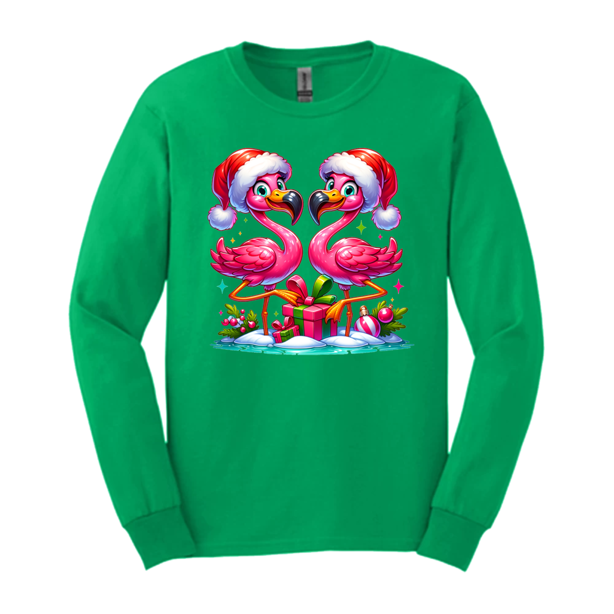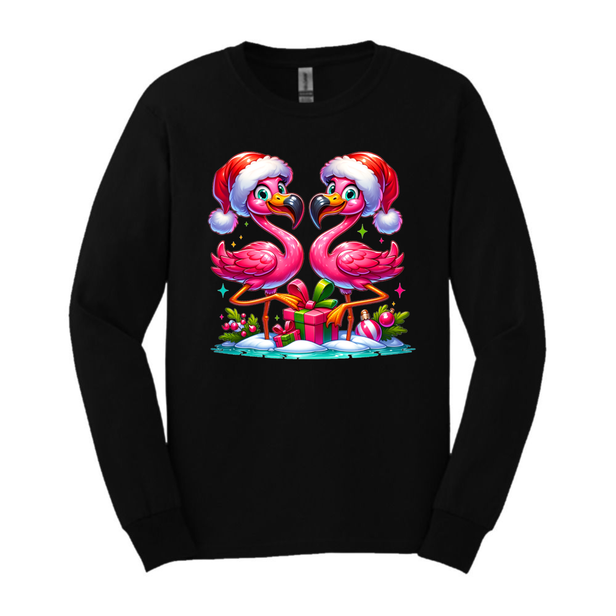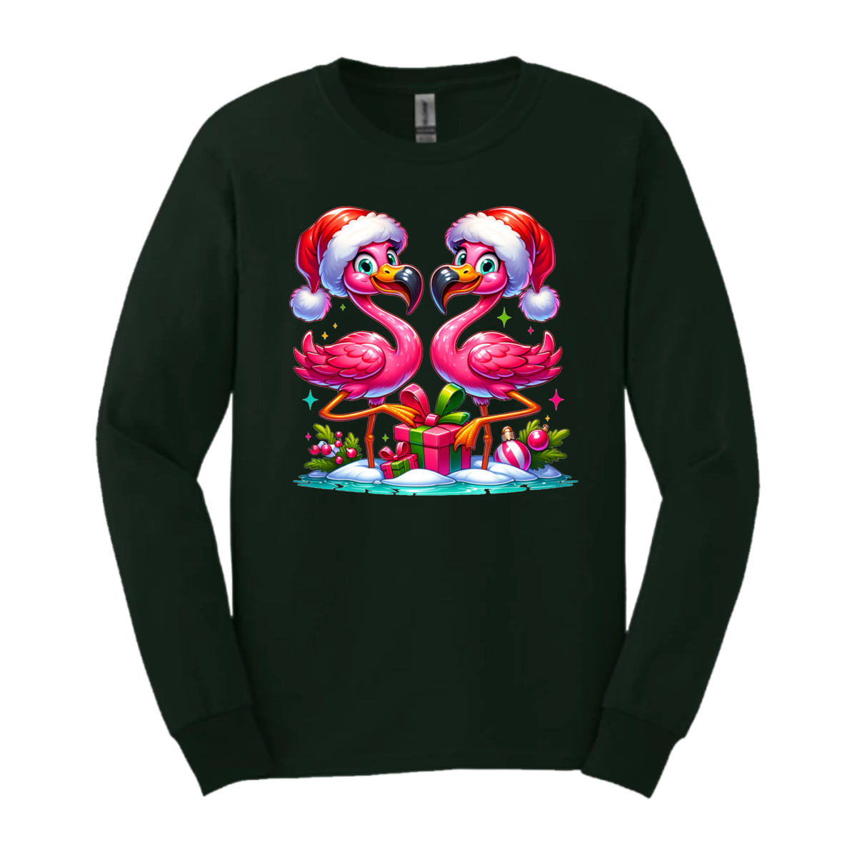Bring tropical cheer to your winter wardrobe with this adorable flamingo Christmas shirt! Featuring two festive flamingos in Santa hats, this long-sleeve tee captures a playful holiday spirit that?s perfect for parties, family gatherings, or cozy nights in. Soft, comfortable, and designed for both men and women, it?s a joyful twist on classic Christmas style.