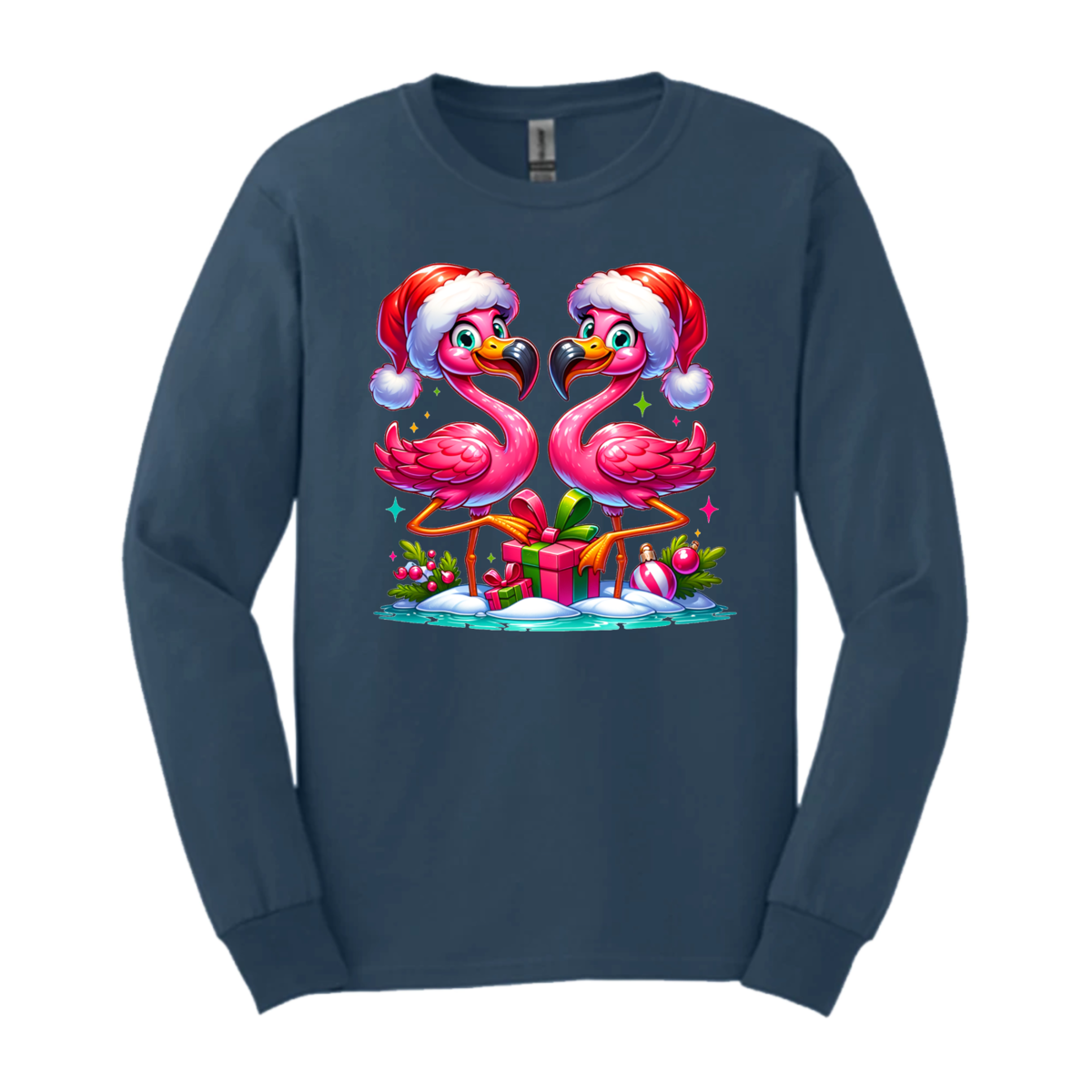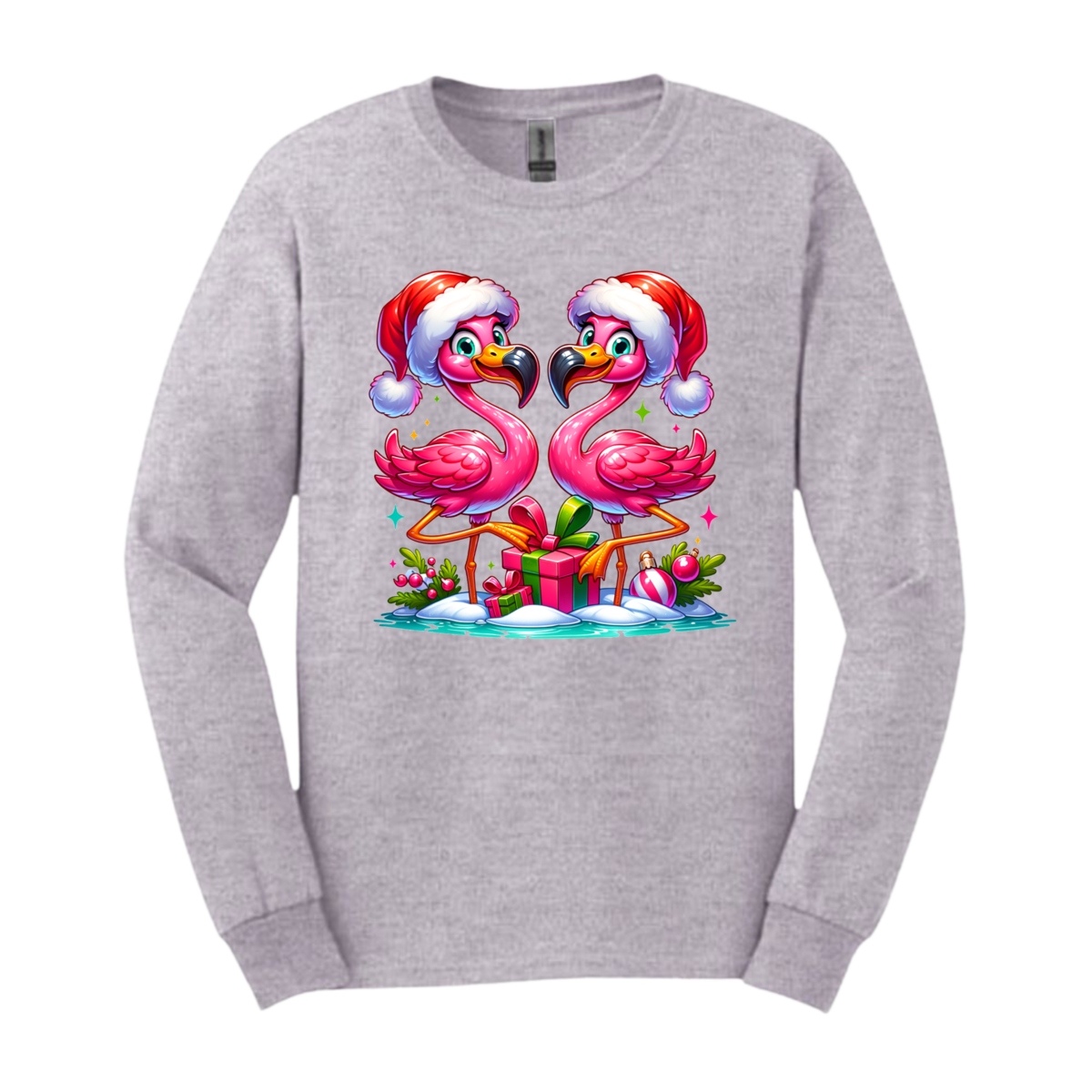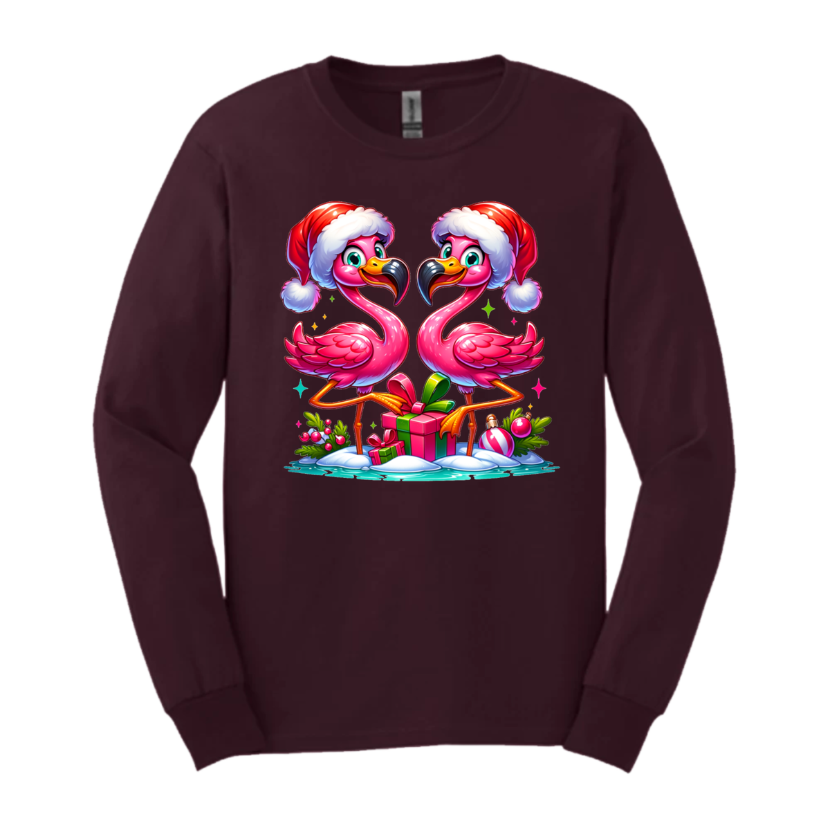 Bring tropical cheer to your winter wardrobe with this adorable flamingo Christmas shirt! Featuring two festive flamingos in Santa hats, this long-sleeve tee captures a playful holiday spirit that?s perfect for parties, family gatherings, or cozy nights in. Soft, comfortable, and designed for both men and women, it?s a joyful twist on classic Christmas style.