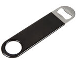 Speed up your bottle service with this black flat bottle opener! Featuring a durable PVC coating this sleek black bar blade makes a handy addition to your busy bar restaurant or event. This easy-to-use opener features a classic flat blade of steel with a thumb hole at one end to pull bottles out of ice and and a letterbox cut at the other to remove the crown seals from a bottle. It easily slips into pockets or attaches to zip strings for fast and convenient use by professional bartenders.