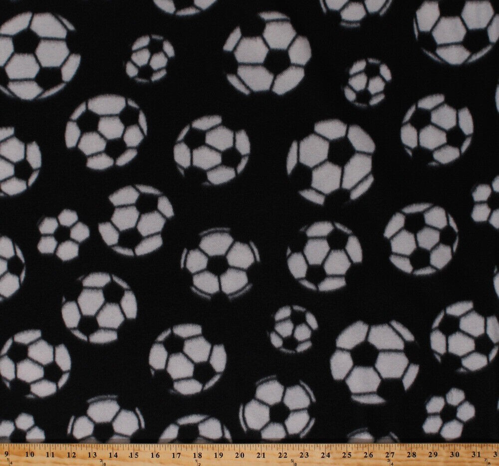 - Fleece Soccer Balls Soccerballs Allover on Black Fleece Fabric Print BTY A409.22