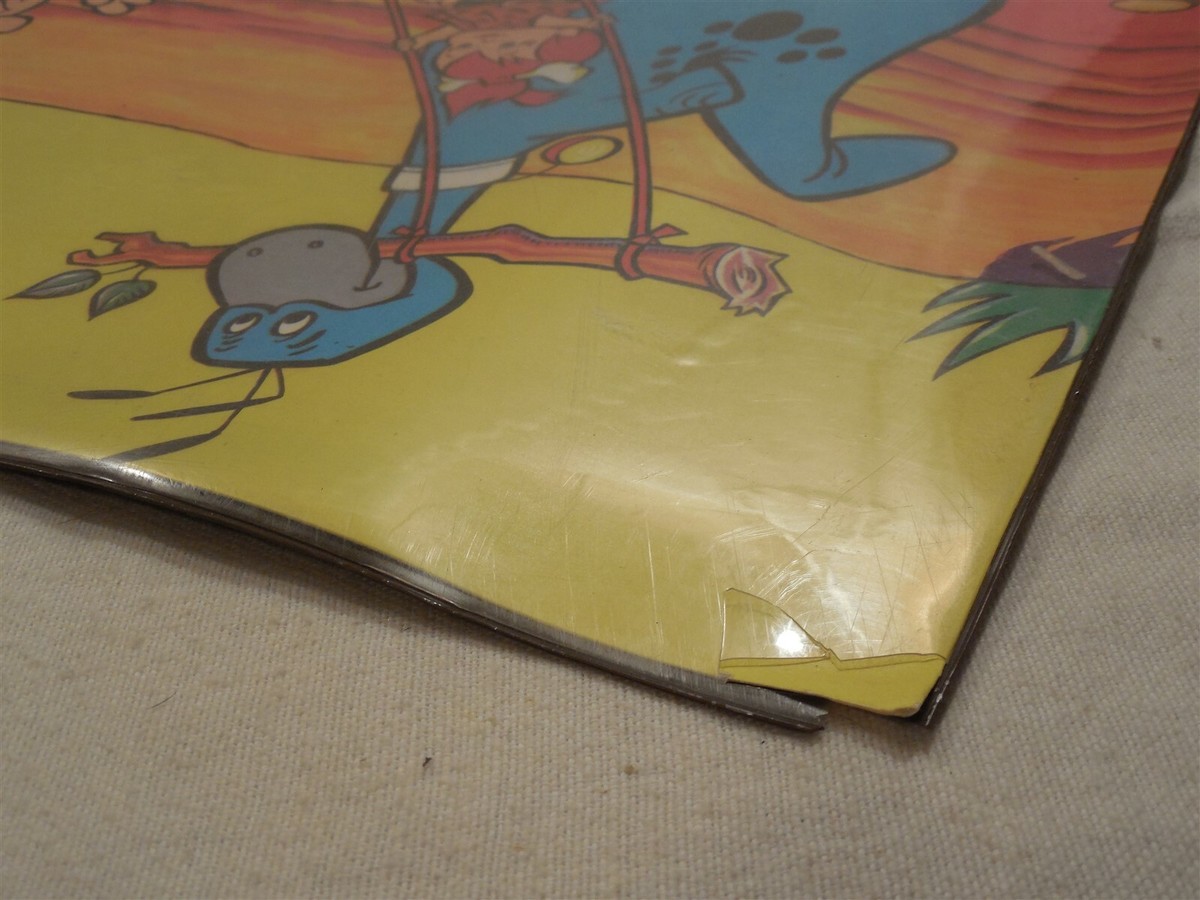 This is a 1975 Flintstones placemat or wall hanging with Fred Flintstone, Pebbles and Dino. The colorful mat is marked 1975 Hanna-Barbara Productions Inc. Pebbles is swinging on a branch held by Dino and Fred is standing in the front looking like he is ready to catch her. The picture is heavy paper or cardboard coated in vinyl which is clear on the front and brown on the back. The mat measures approximately 17 1/4" x 12".