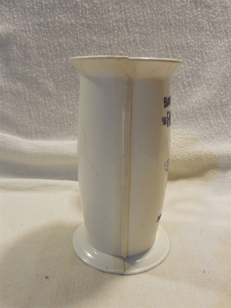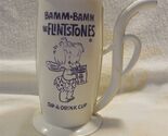 This is white plastic Flintstones sip-a-drink cup. The white cup pictures Bamm-Bamm Rubble drinking from a sip-a-drink cup. The picture and writing on the cup are in blue. The cup stands approximately 5" tall.