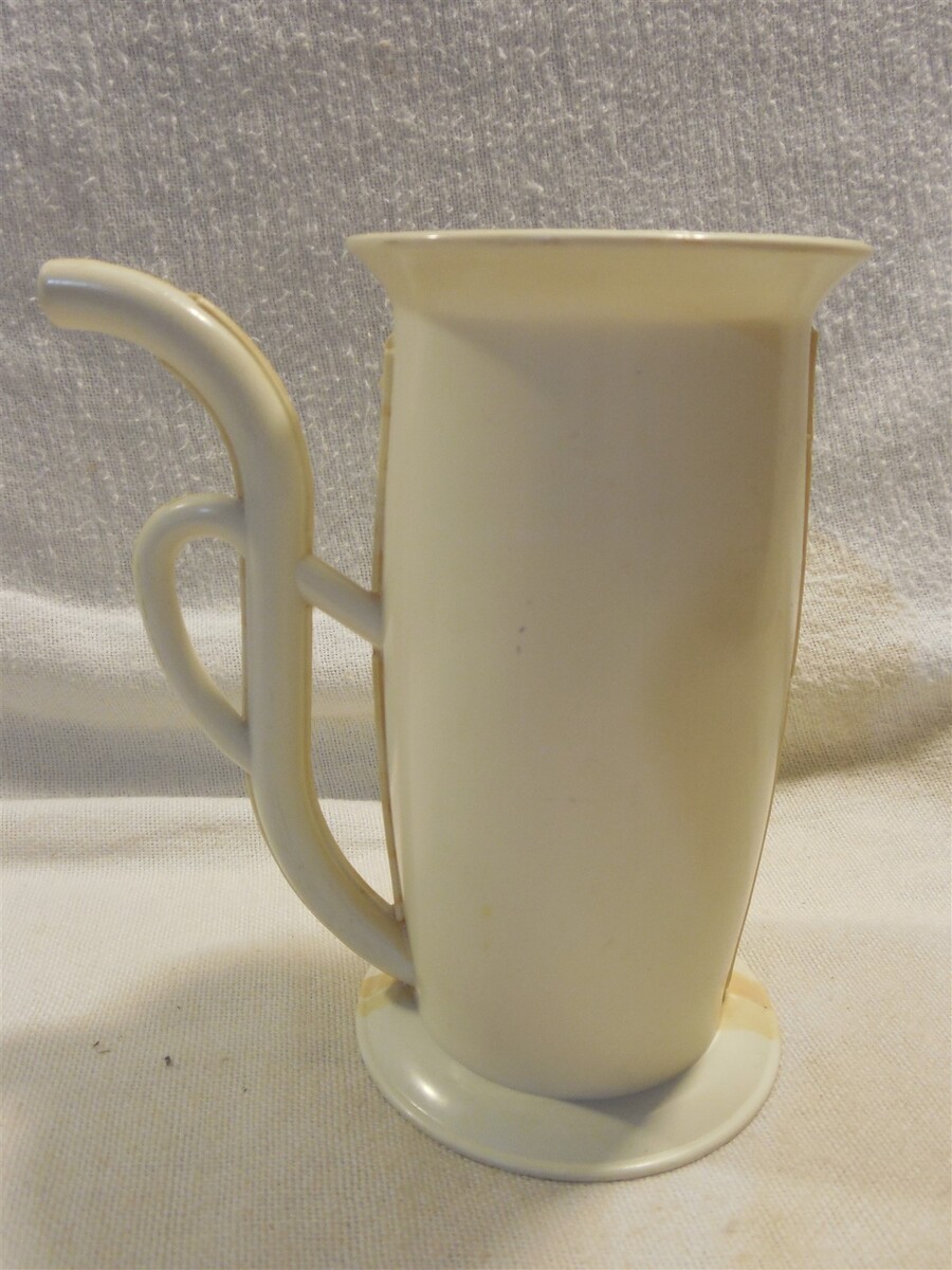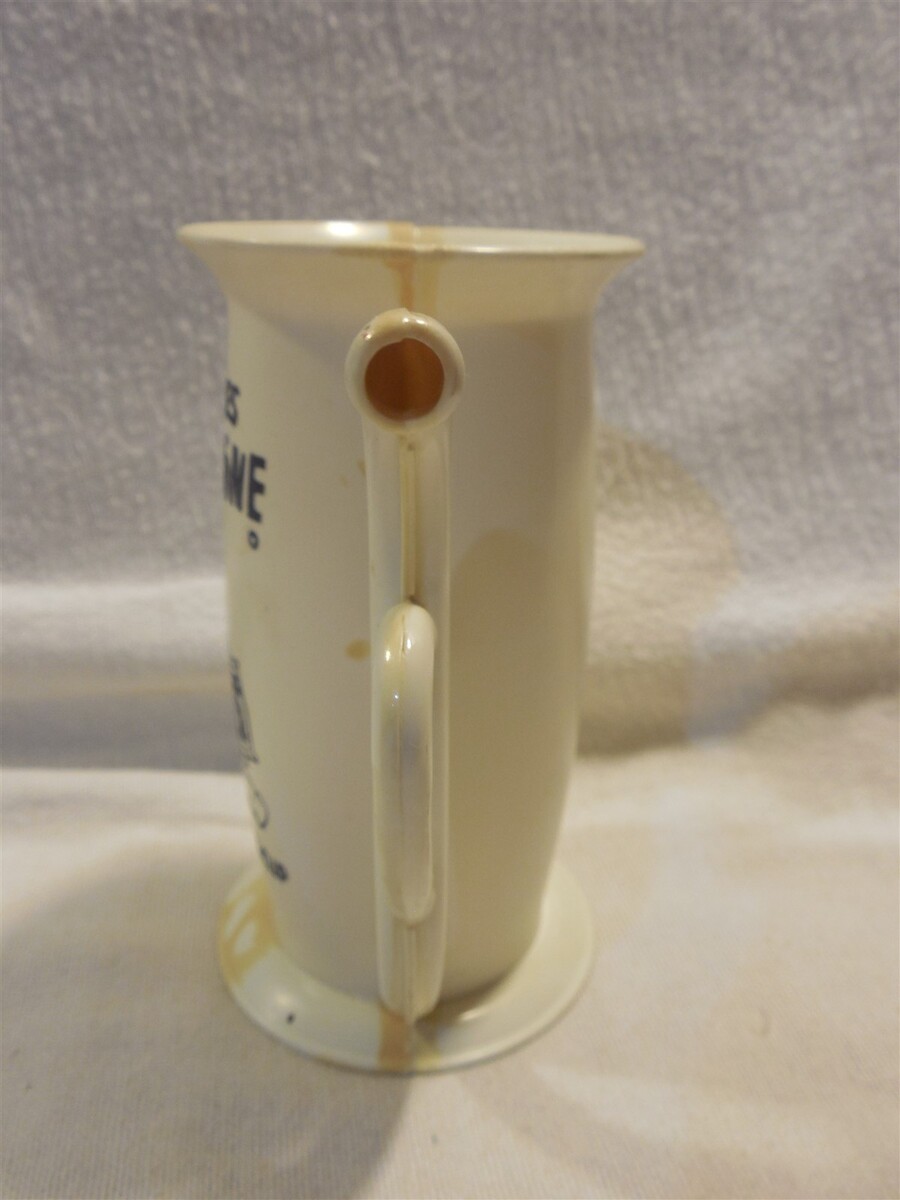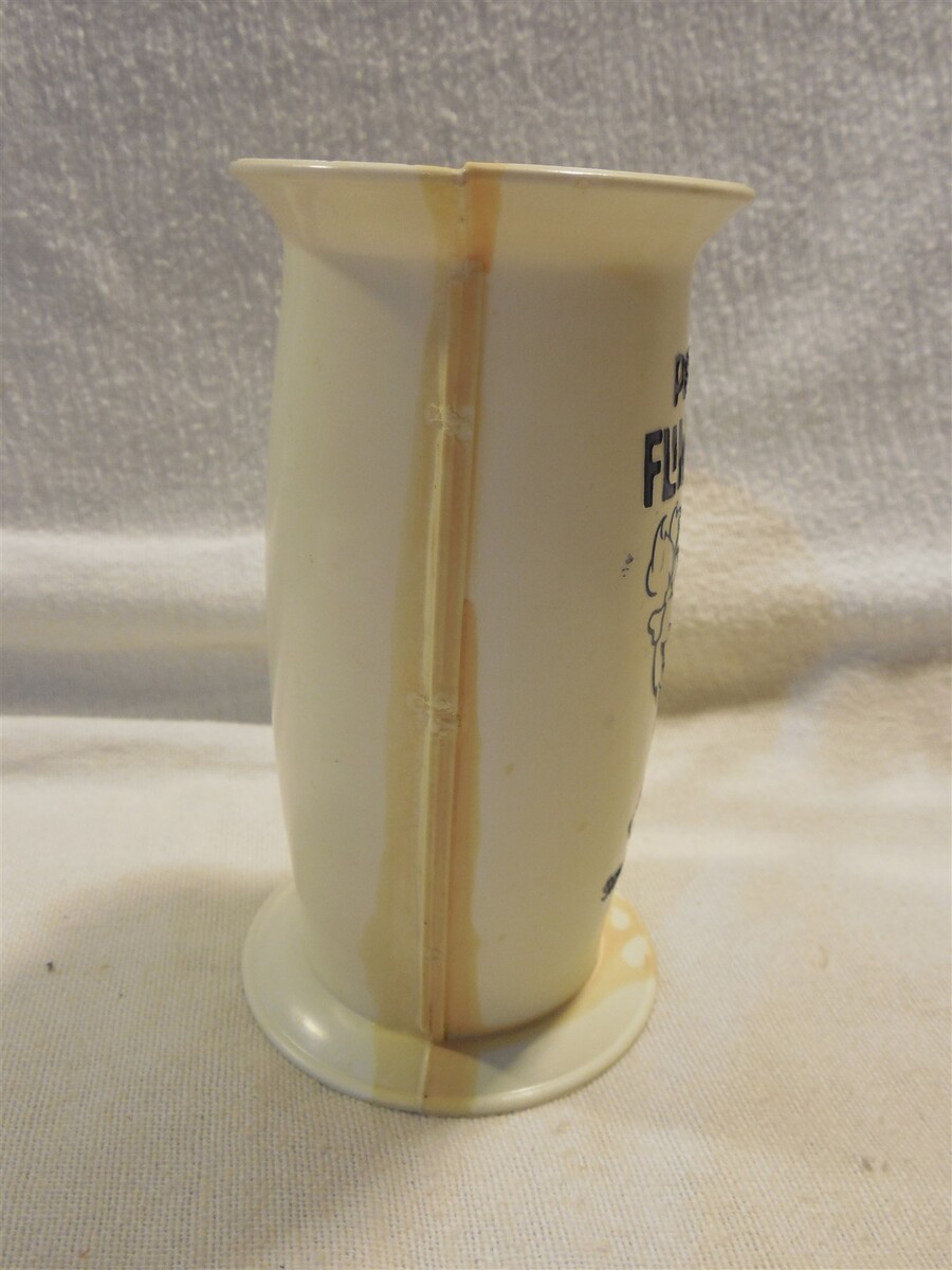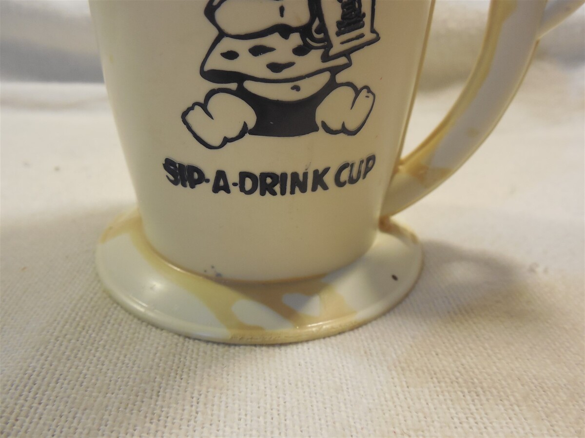 This is white plastic Flintstones sip-a-drink cup. The white cup pictures Pebbles Flintstone drinking from a sip-a-drink cup. The picture and writing on the cup are in blue. The cup stands approximately 5" tall.