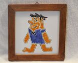 This is a Flintstones wood framed ceramic tile picturing Barney Rubble. The square ceramic tile measures approximately 5 1/2" x 5 1/2". The tile is mounted in a wooden frame which measures approximately 7" x 7". There is a hanging loop attached to the frame. The tile is marked on the back Bechi. The tile is mounted with only tape which should probably be replaced if the new owner wishes to hang the tile to ensure it is secure.