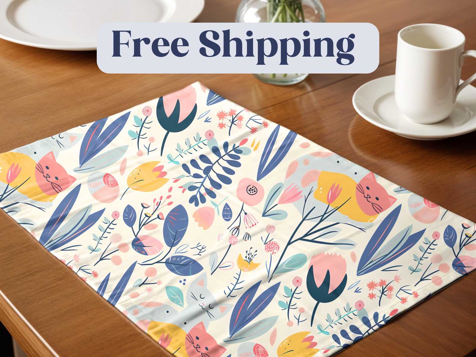- Floral Cat Dining Set Table Runner, Placemats & Napkins Whimsical Cat Table Deco