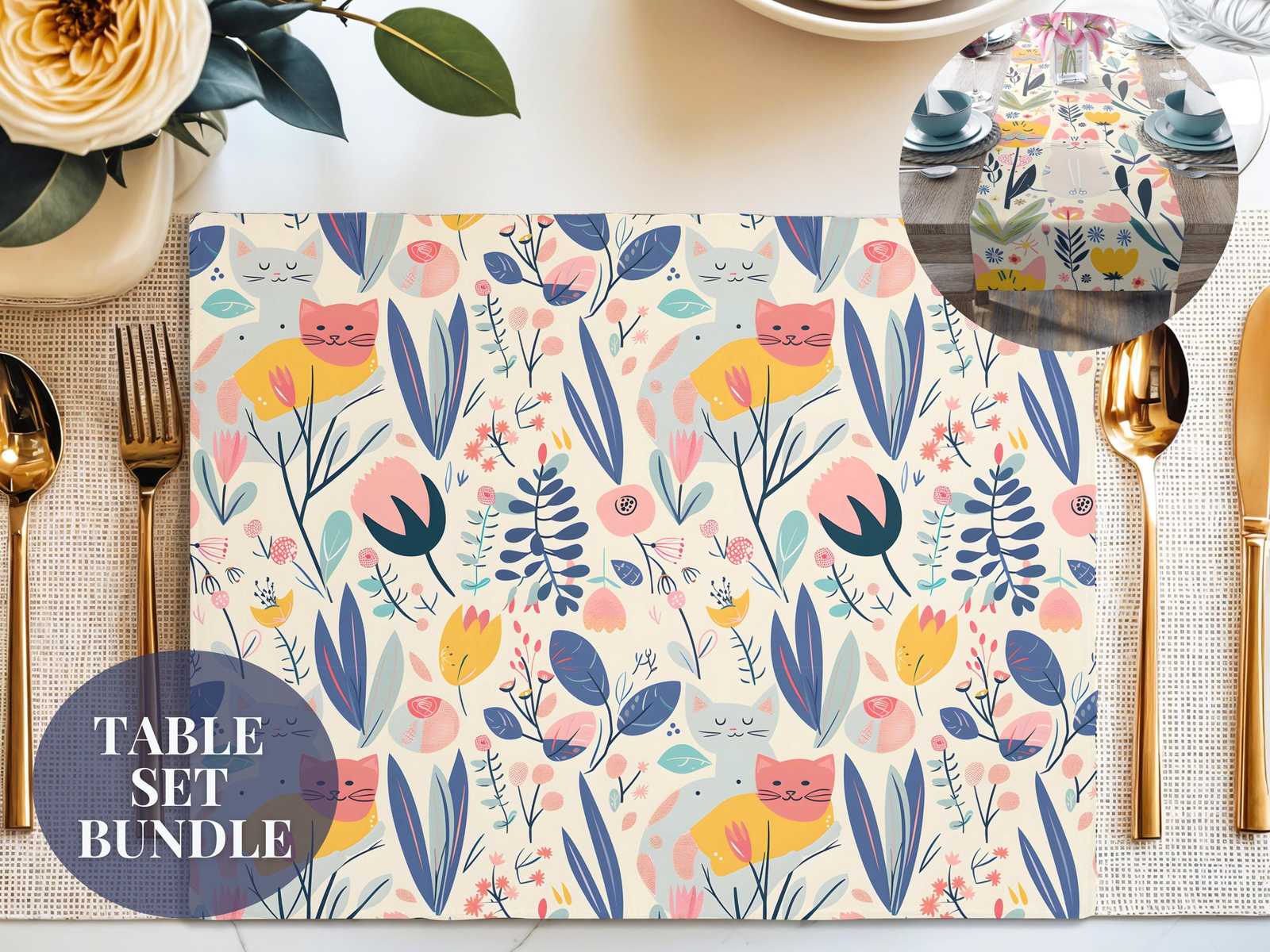 ? Floral Cat Table Runner, Placemats, and Napkins Set ? Coordinating Dining Set for Cat Lovers ?