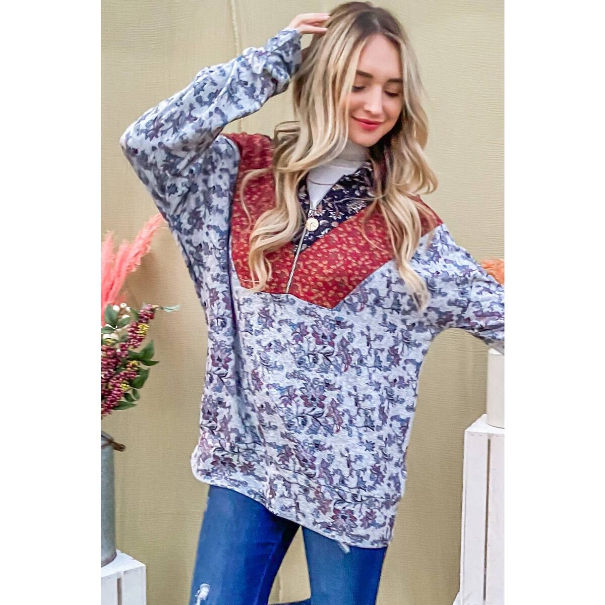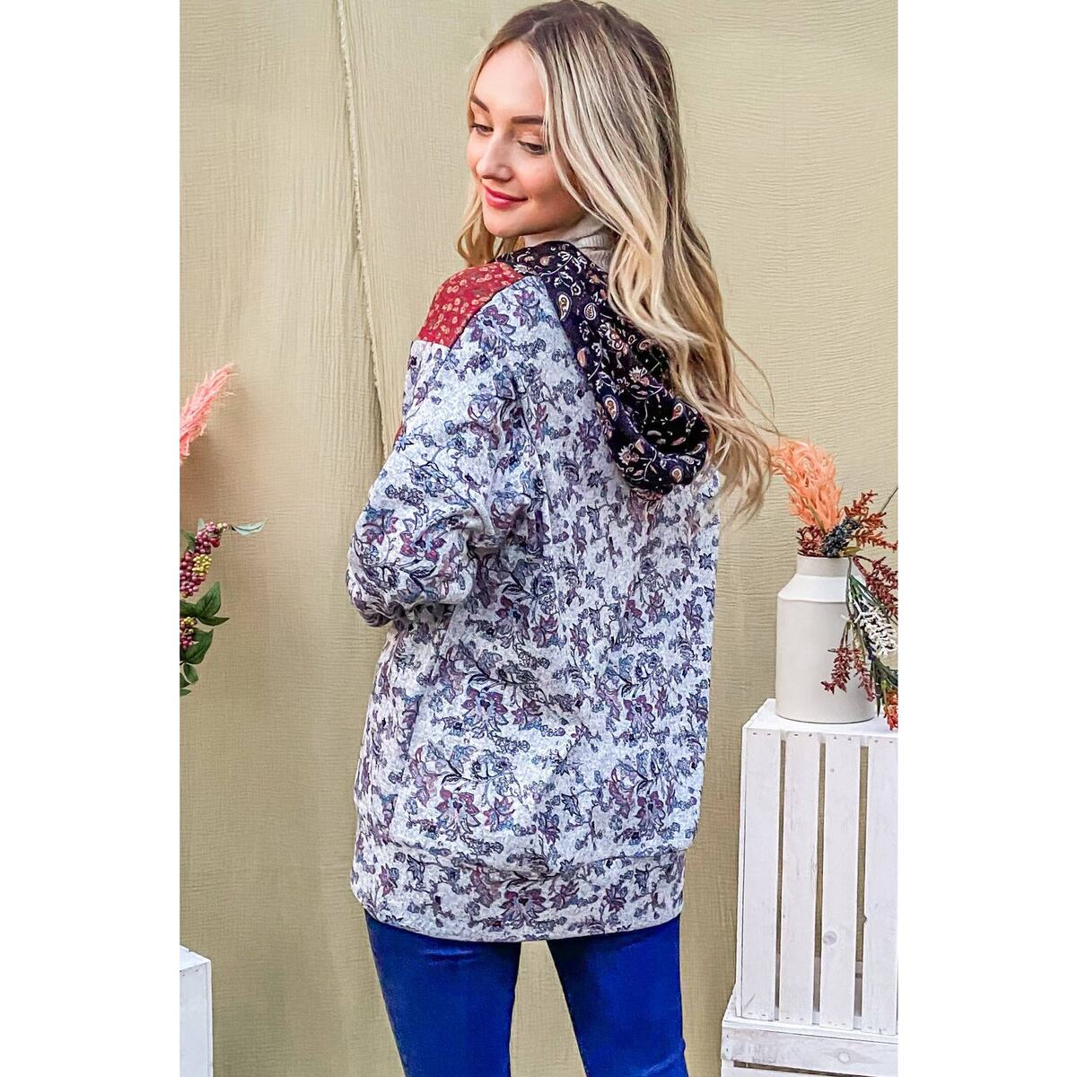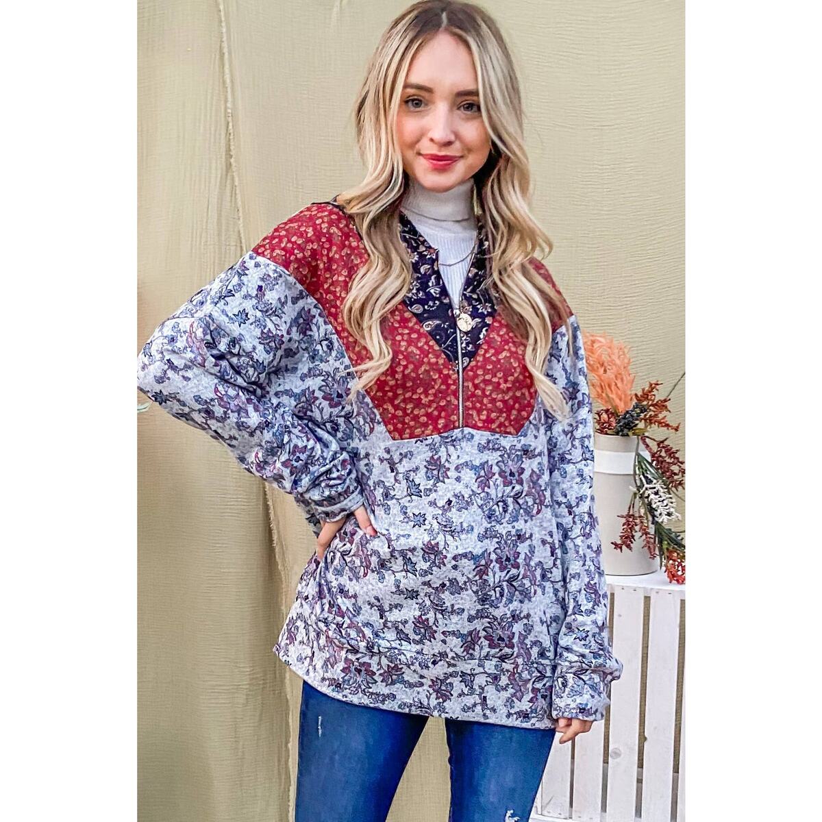 Experience the perfect blend of style and comfort with the Floral Pattern Block Half Zip Up Hoodie by AND THE WHY. This women's hoodie, designed with a casual aesthetic, features a unique floral pattern block that sets it apart. Made with 95% cotton and 5% spandex, it ensures a comfortable fit while providing the warmth needed for the fall and winter seasons.