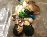 This is a vintage gold-tone brooch with green and black faceted stones, faux pearls, and leaf accents. There is one small missing pearl. Hardly noticeable.