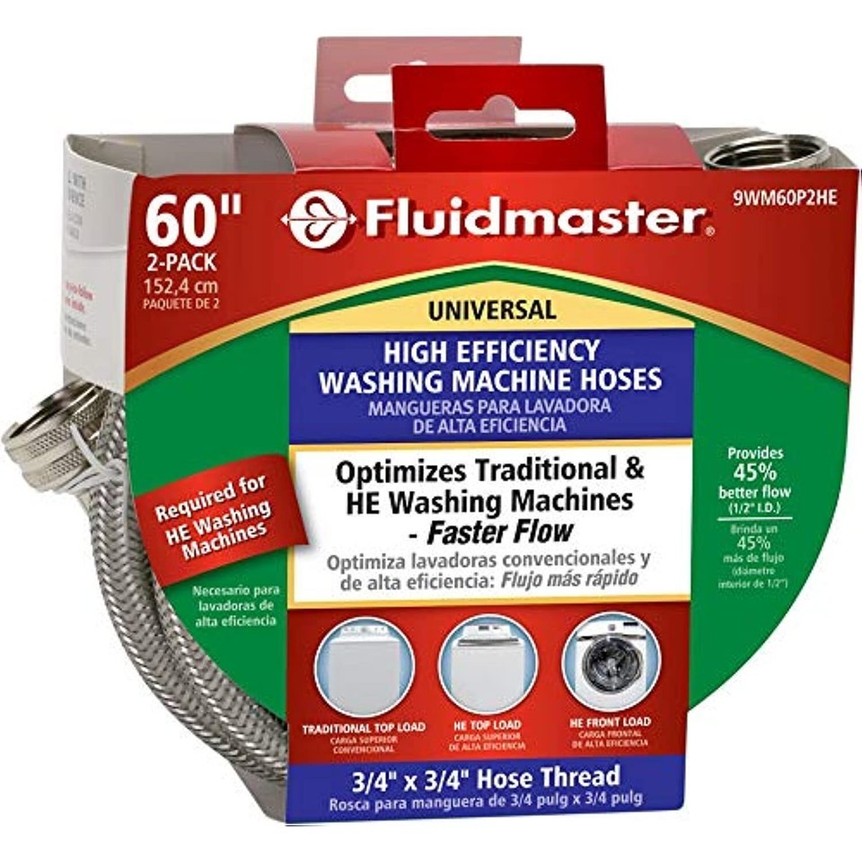 End 1 Diameter: 3/4 in. End 1 Connection: Hose. End 2 Diameter: 3/4 in. End 2 Connection: Hose. Material: Braided Stainless Steel. Application: High Effieciency Washing Machine. Length: 60 in. Working Pressure: 1000 psi. Exceptional flexibility for fast, easy installation. Heavy-duty brass hex nuts are easy to grip and nickel plated for durability. Exceeds code requirements for flexible water connectors. Package Size: 2 pack.