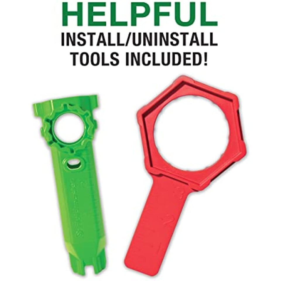 Color-coded, helpful install tools included for the fastest installation possible, Includes toilet tools, dual purpose package to catch water, universal gasket system, durable hardware and tank lever, 7 year warranty