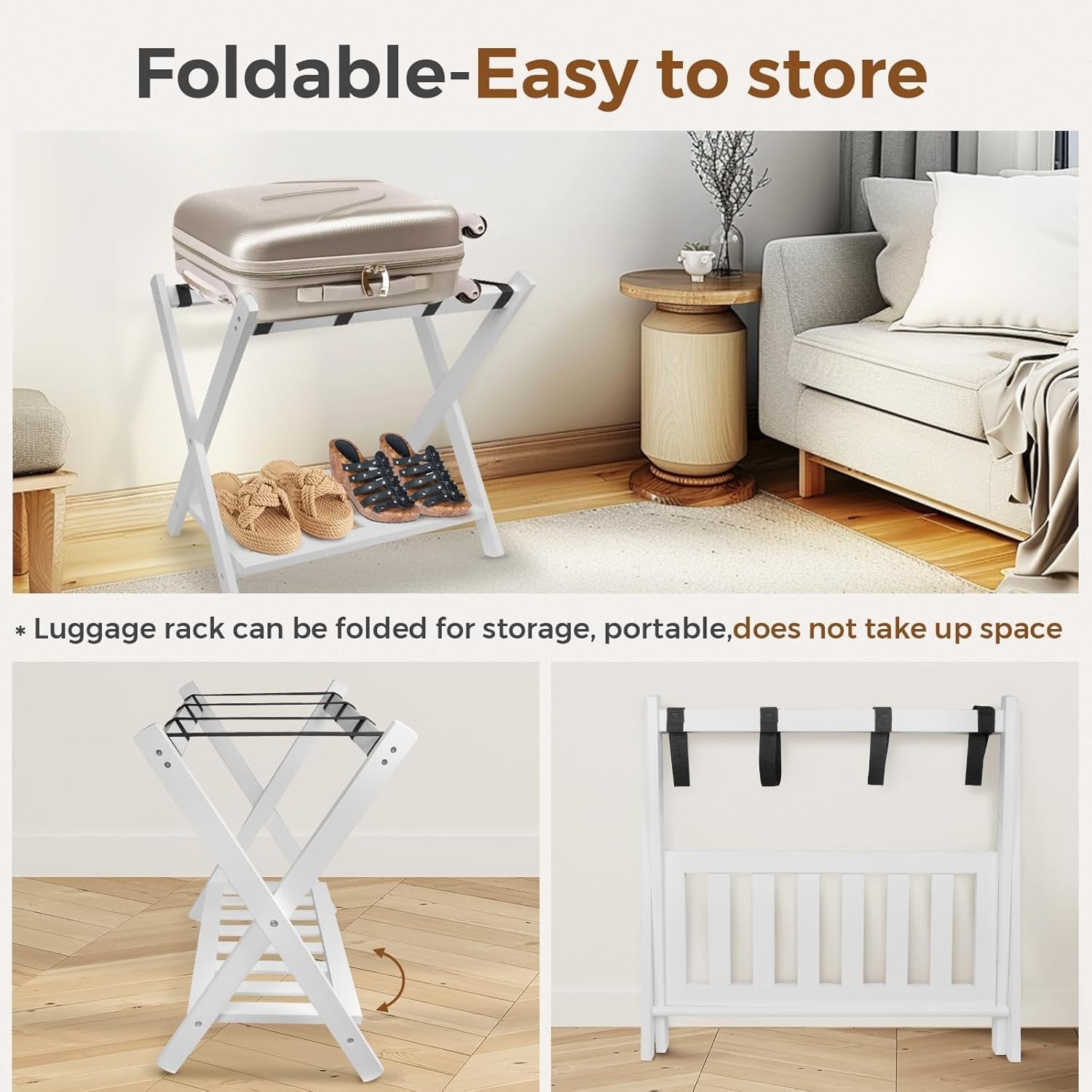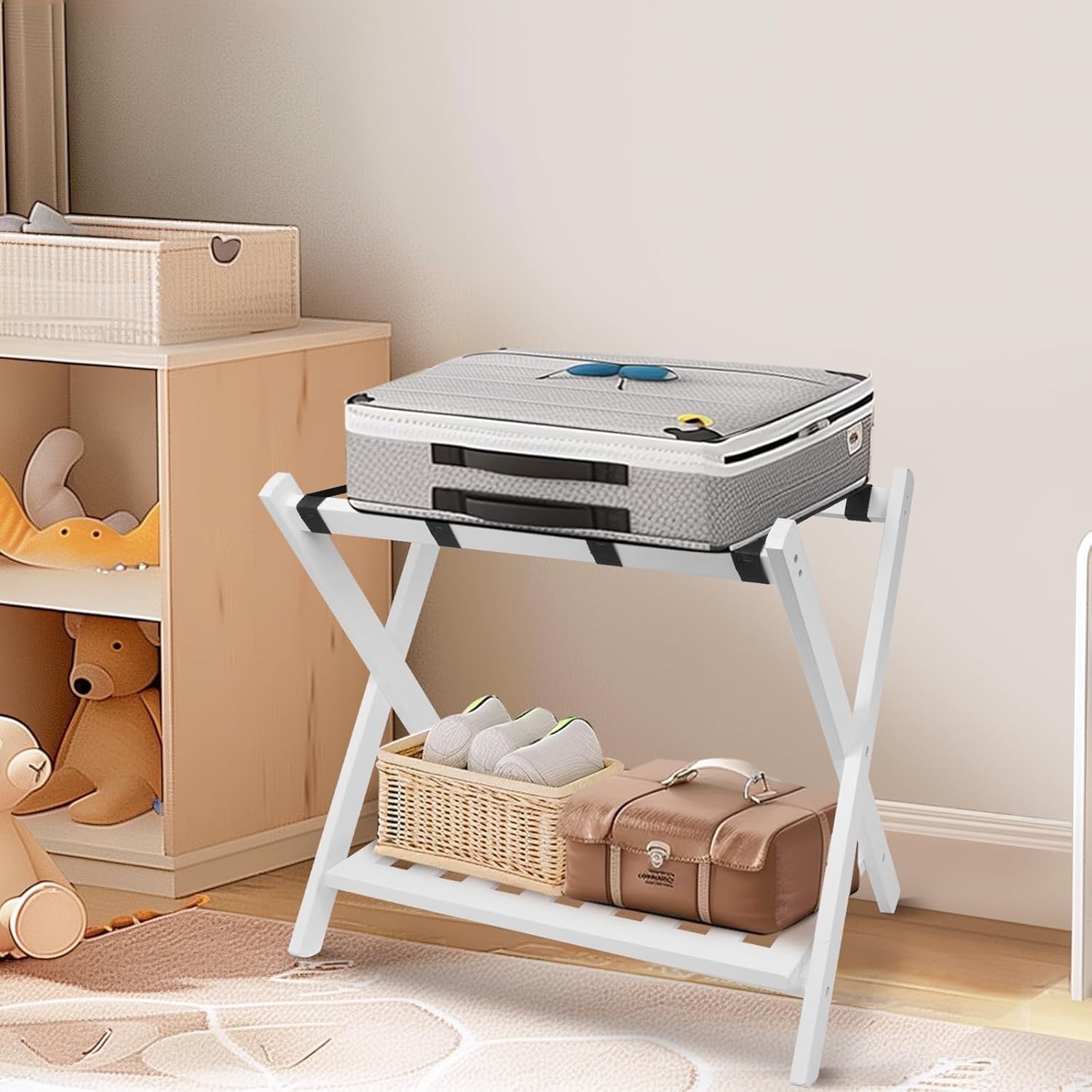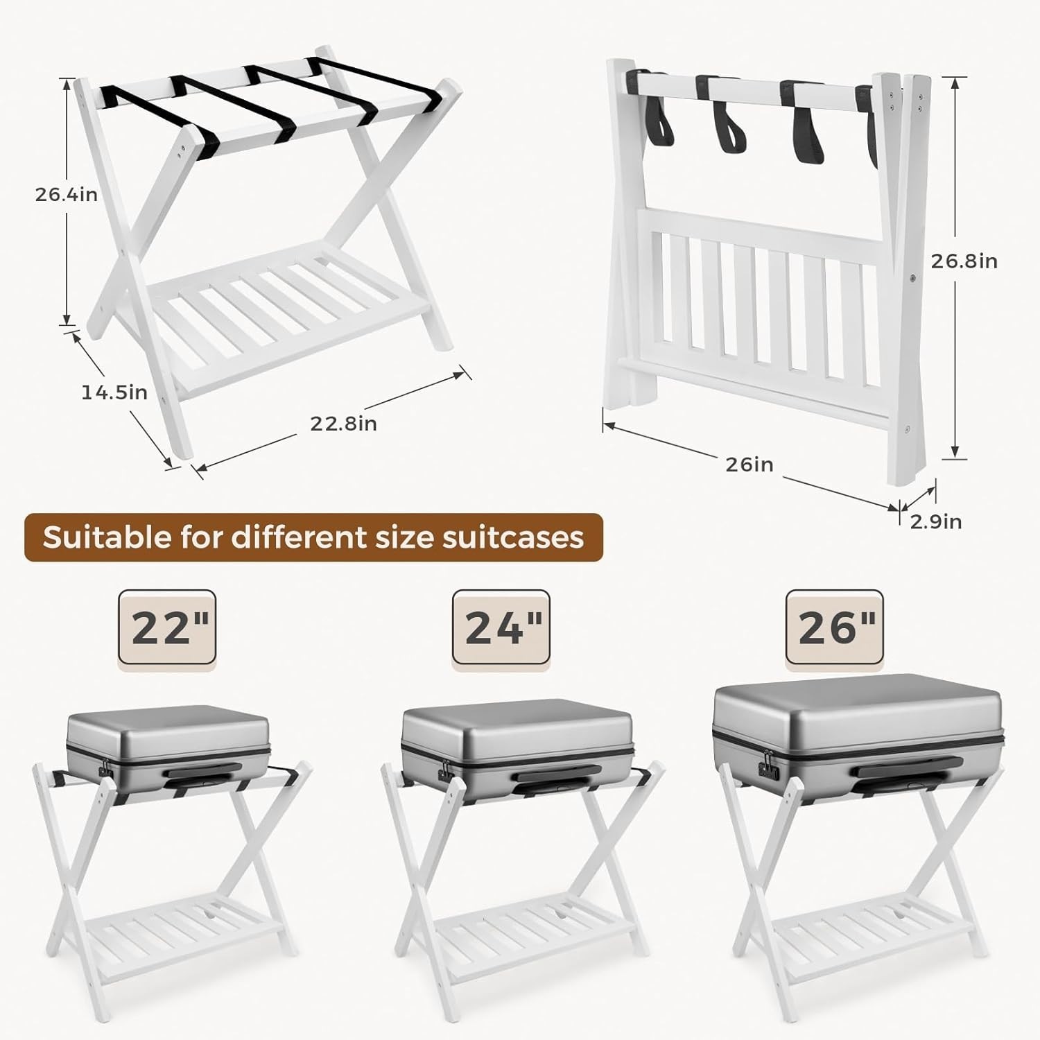 Sturdy and Stylish: The natural wood frame combined with robust nylon straps supports up to 150lb on the top and 50 lb on the lower shelf. The natural wooden finish adds a personal touch to bedrooms, guest rooms, or hotels