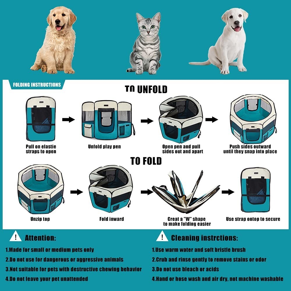 ?Easy to open and fold?It just takes seconds to open the kitten playpen from folded position. No assembly needed. Also you will feel simple and interested to fold the dog playpen after you look our picture/viedo/the instruction. Our portable pet playpen can be used on indoors,outdoors,traveling,camping and etc.