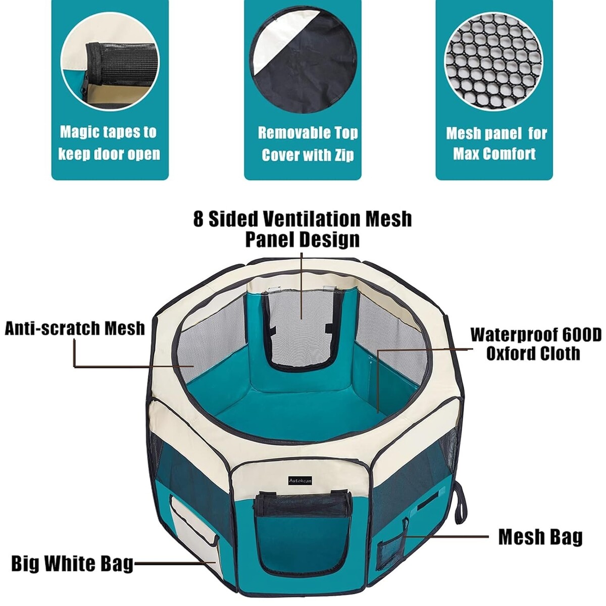 ?Pet friendly design?There are 8-panel roomy design with protected seams and reinforced comers in Autokcan puppy playpen. You can open the top cover and front door easily with the attached zippers. The top is the removable mesh shade cover with 1/3 shade area and 2/3 dynamic air-flow netting, which makes it possible for your lovely pet to hide from the sun and breath the fresh air.