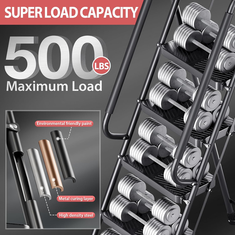 Folding 5 Step Ladder, Portable Ladder for Multi-Purpose, Home, Kitchen, Heavy Sturdy Steel Step Stool with Anti-Slip Wide Pedals, Handrail, Safe-Lock Design, Pass 500Lbs Load Testing, Black