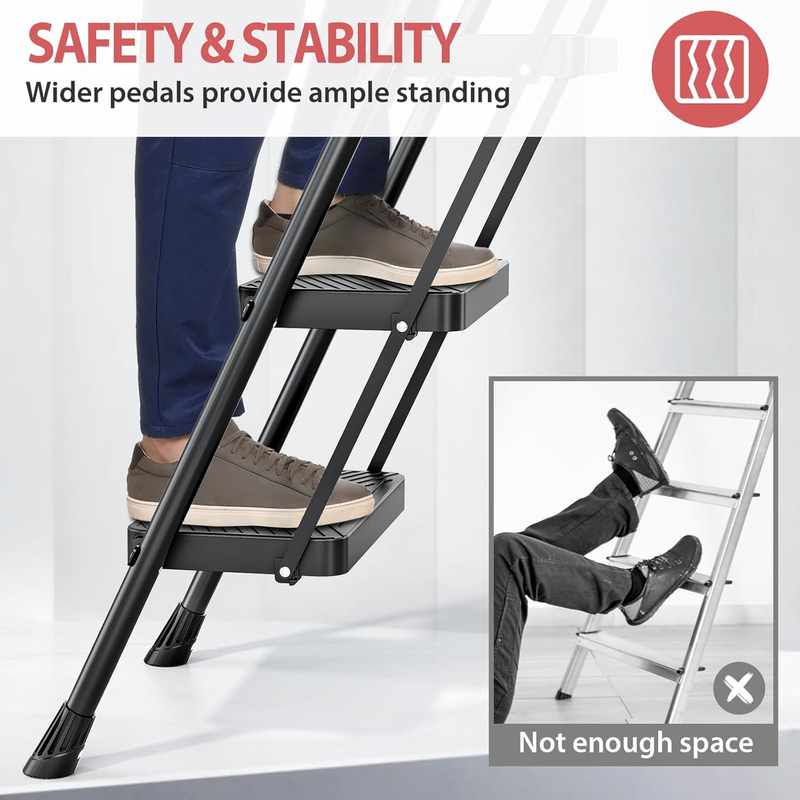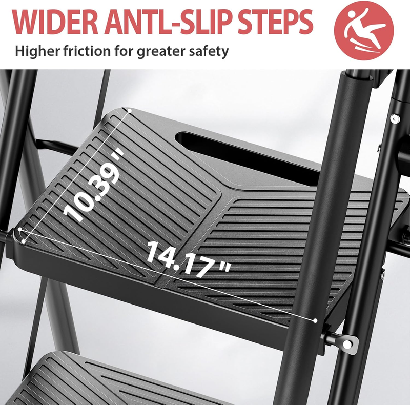 Anti-Slip Wide Pedals: Folding step ladder features wide, non-slip textured treads that provide ample foot support. It also has non-slip rubber arms for easy climbing and carrying