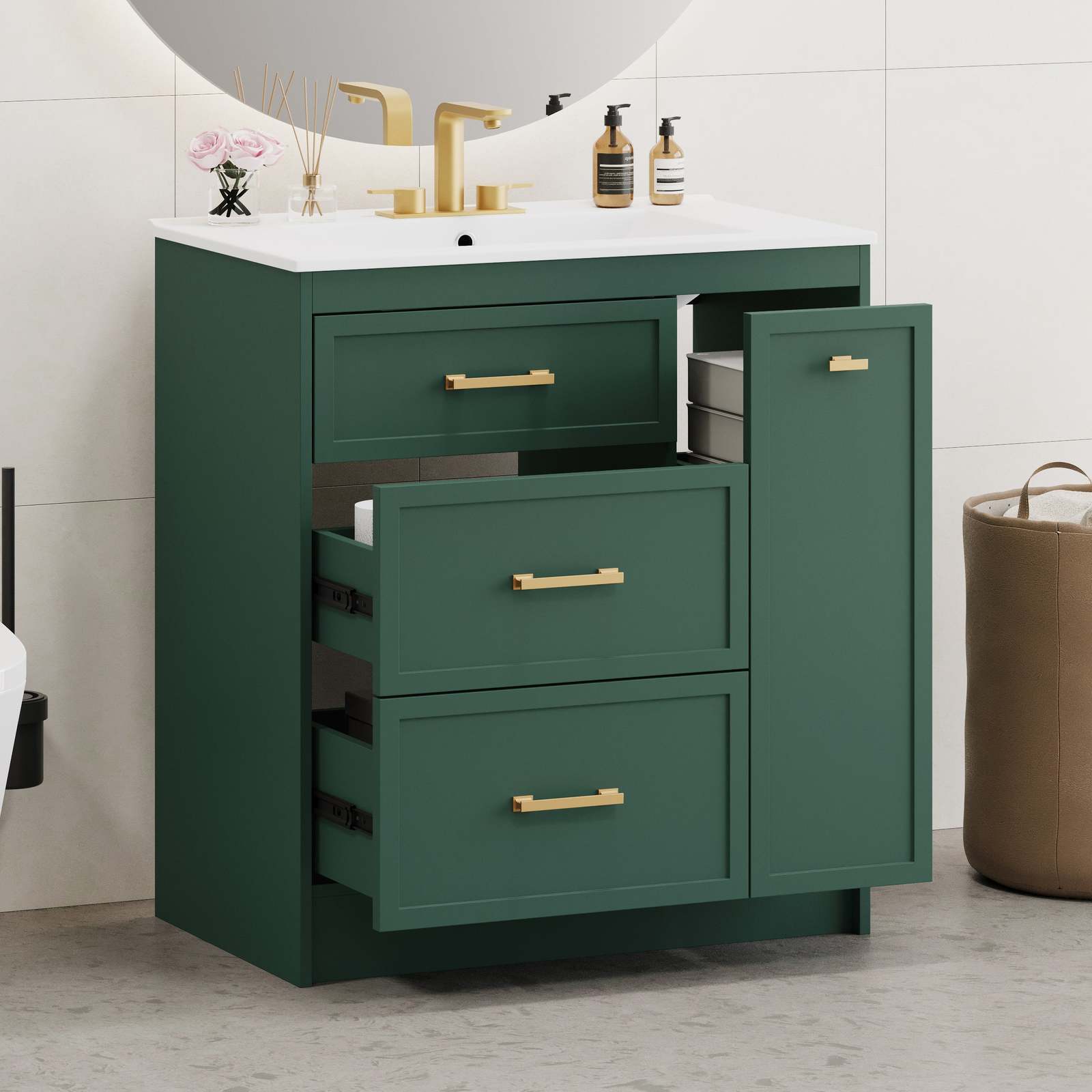 Transform your bathroom into a serene retreat with this 30' wide vanity, designed to elevate both space and style in smaller bathrooms. Its forest-green elegance and golden accents add a timeless sophistication, while the ceramic basin with overflow promises effortless maintenance and a clean, dry space. Every inch is crafted for functionality: a double-layer drawer and deep compartments offer ample storage, keeping essentials organized and within reach. Built with durable MDF, this piece embodies enduring quality, blending beauty and utility seamlessly. Envision the harmonya??where form meets function in your personal sanctuary.
