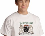 Product description: Forrestall Irish Coat of Arms Tee Shirt in White. Every Irish family has a story to tell, probably hundreds of stories. Your Irish coat of arms is a visual record of your family's oldest, most significant stories. Here, they're told in bright, permanent artwork on these fine-quality, 100% cotton Gildan tee shirts. Over 25 years of heraldry research and over 1000 available Irish family coat of arms.