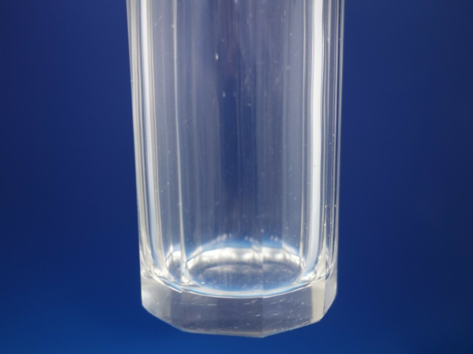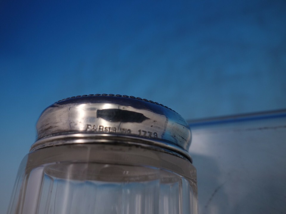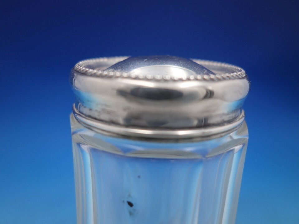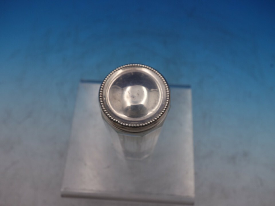 Wonderful glass dresser jar with sterling silver top by Foster Bailey, marked #1779. This piece measures 4 1/4" x 1 3/4". It is not monogrammed and is being sold As-Is with some dents in the top and a chip in the base of the glass. Superb!