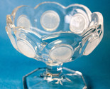 Fostoria clear coin glass compote, jam or jelly bowl, with scalloped rim, frosted 1886 American Eagle and Liberty Torch medalliions. Pedestal bowl has octoganol foot. Top is 4-3/8" in diameter. Height is 3-5/8". This pattern was produced from 1958 to 1981. Pre-owned, perfect condition.