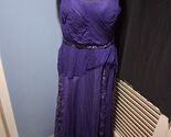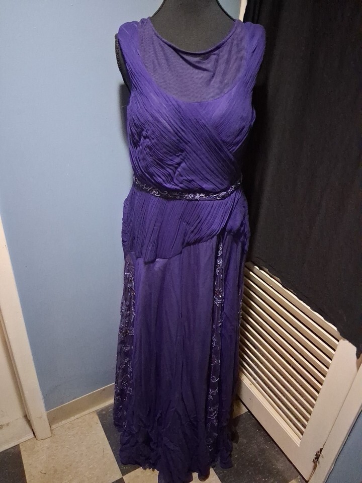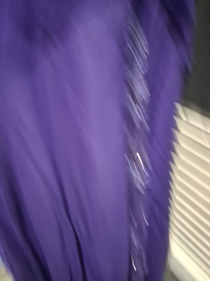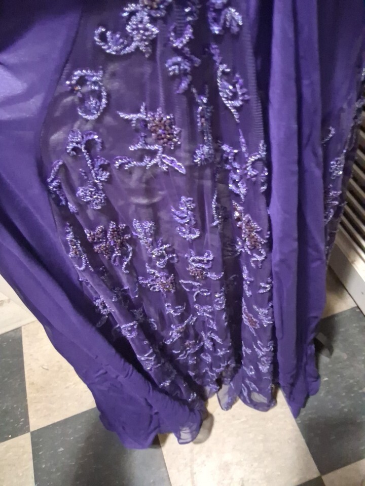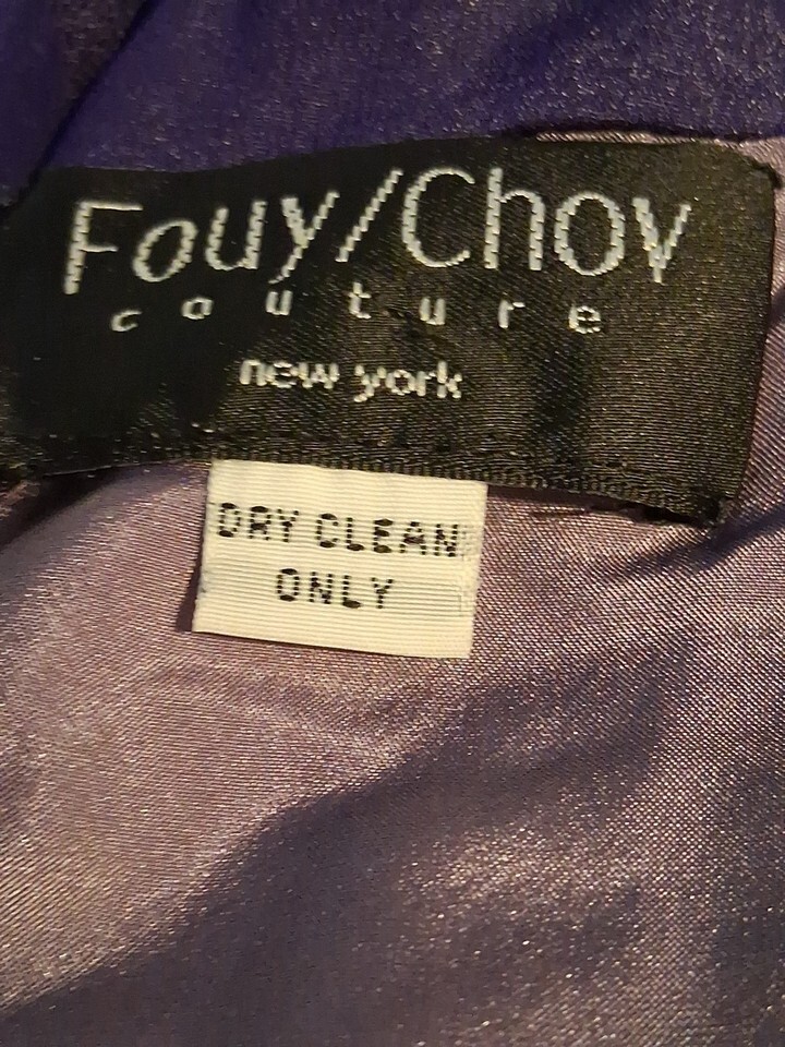 The Fouy Chov Couture New York Women's Evening Gown is a stunning purple gown perfect for special occasions like weddings, parties, or formal events. This elegant dress features a sleeveless design with a round neck and intricate beading accents, adding a touch of glamor. Made of polyester mesh fabric, this long dress has a zipper closure and a cap sleeve style,padded bra,lined making it a stylish and sophisticated choice for the summer, fall, or spring season. The brand Fouy/Choy is known for its attention to detail and high-quality craftsmanship, making this gown a standout choice for any occasion. 2 buttons missing in back- see pics ,chest size 32/34