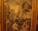 Fragonard, Jean-Honore, "Surprise", New York: E. S. Herrmann, early 20th cent. Color reproduction of original painting. Imprinted "E.S.Herrmann N.Y. on the back. Very good condition, it is framed with a golden border, gold is kind of rustic, I do not know if it is for the age or purposedly done. 22" by 18" total dimension including the frame, area of print in 12 1/2" by 16 1/2".