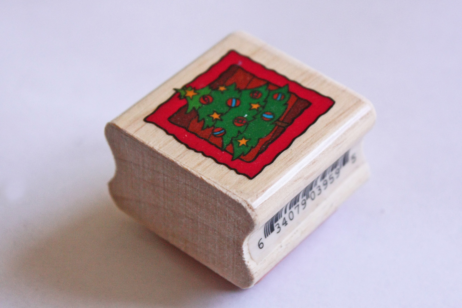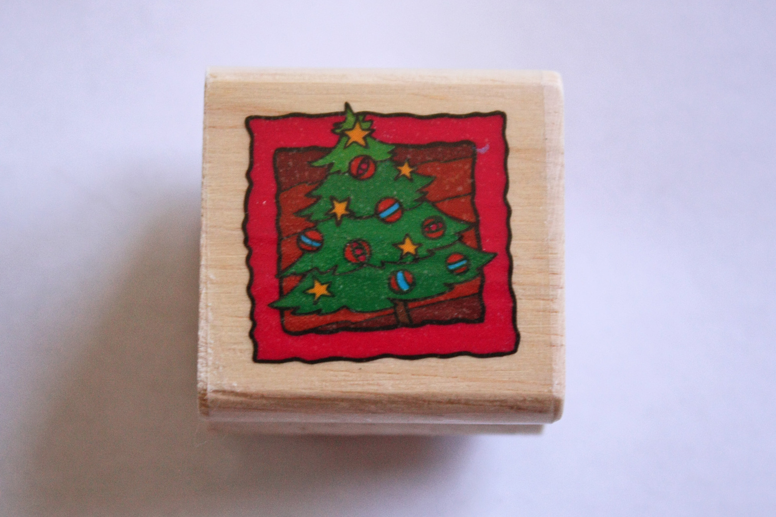 This is a Christmas tree mounted rubber stamp that is in like new condition. The image is a decorated Christmas tree in a frame. There is no ink on the rubber or wood. The stamp is 1.25" x 1.25" with a 1" x 1" stamp area.
