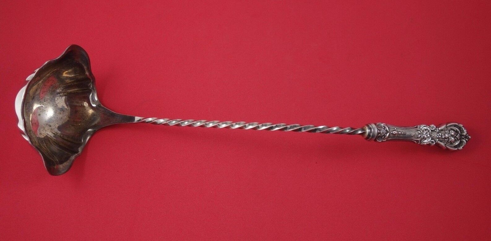 Francis I by Reed Barton New Script Mark sterling silver hollow handle Soup Ladle All Sterling, Original, Twisted Handle, 14 1/2". It is not monogrammed and is in excellent condition.
