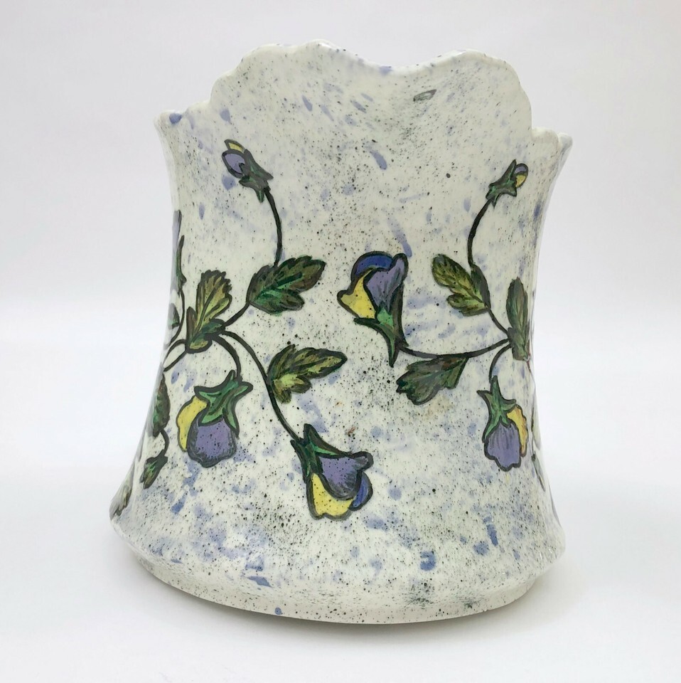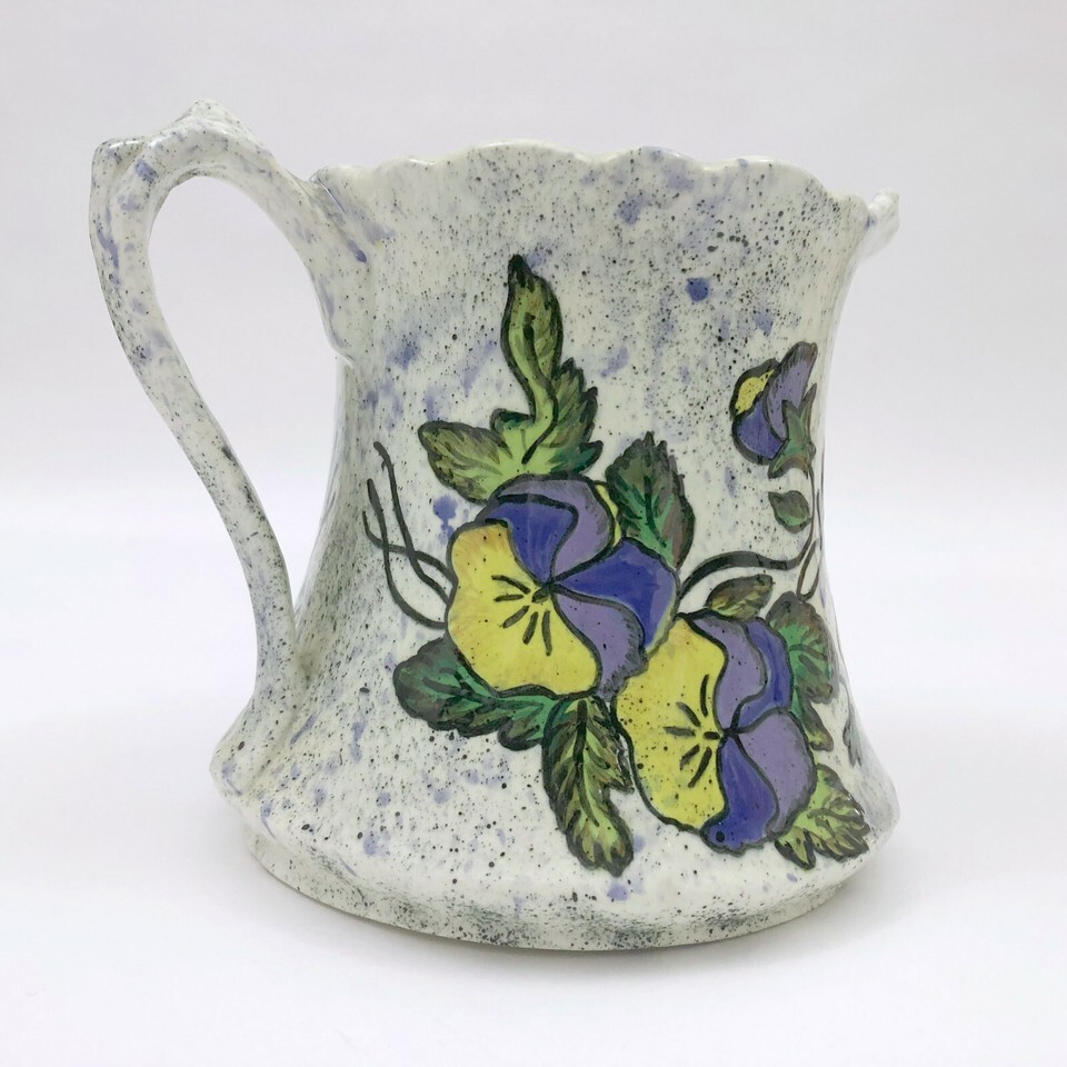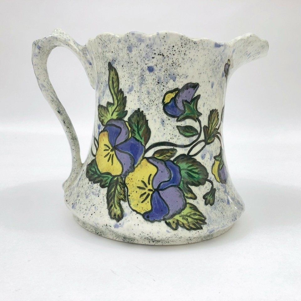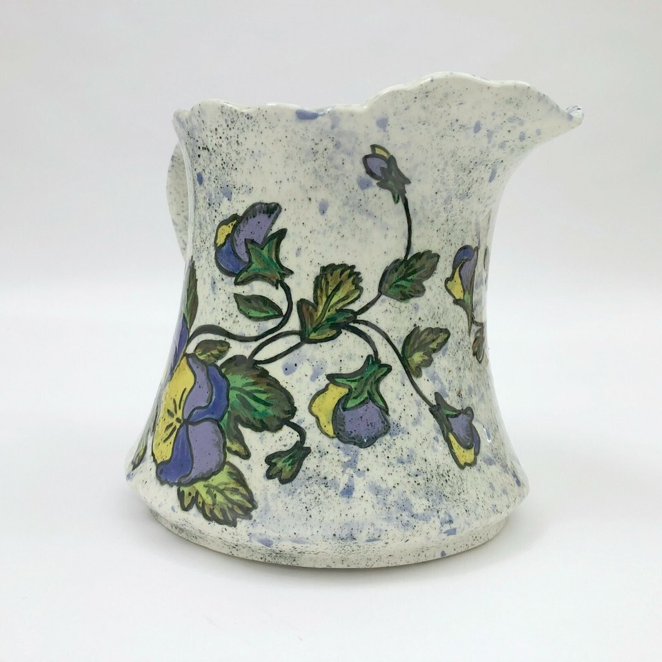 EUC, Excellent Used Condition. Vintage signed dated, 1958, Frank Flores speckled pitcher with purple yellow pansies. There are blue speckles on a white background with beautiful purple yellow pansies twining around the pitcher. It's almost too beautiful to use.