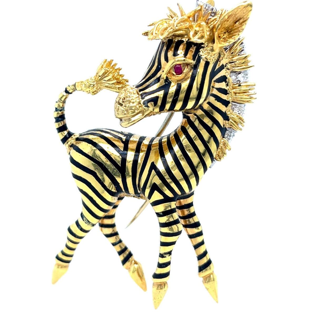 Frascarolo 18K Gold, schwarzer Emaille, .01CT Ruby und .10ct Diamond Zebra Pin/Brosche