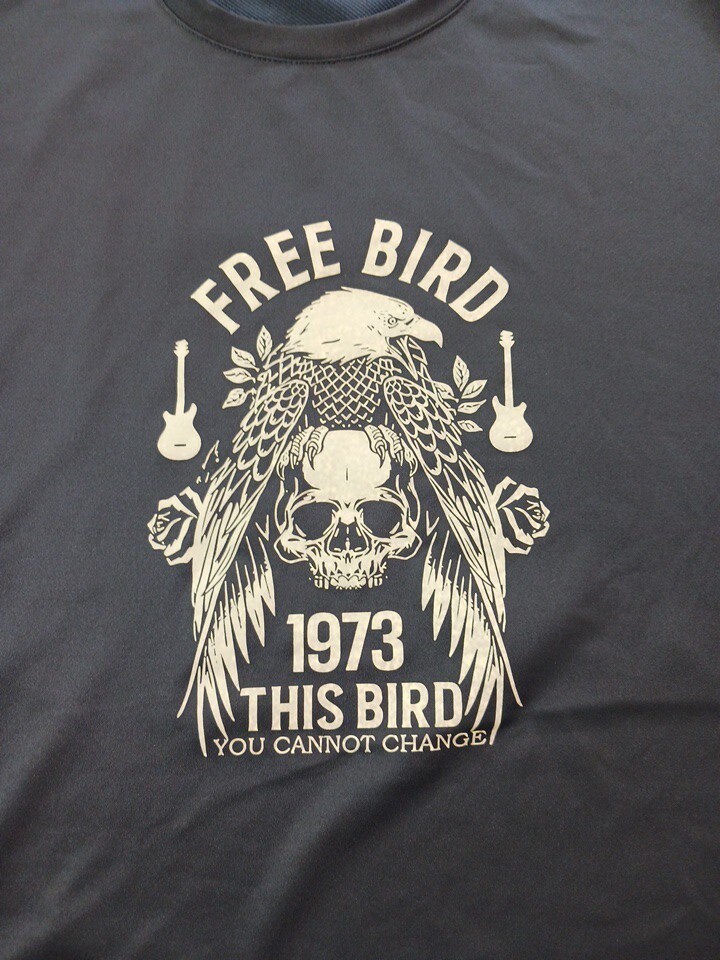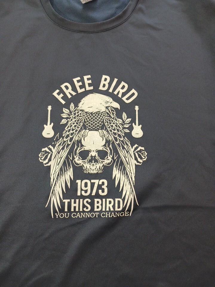 Get ready to rock the Boho Retro style with this Free Bird Shirt. Inspired by vintage music and fashion, this blue graphic T-shirt is perfect for any season. Made from high-quality cotton, this regular fit shirt features short sleeves and a designer touch.