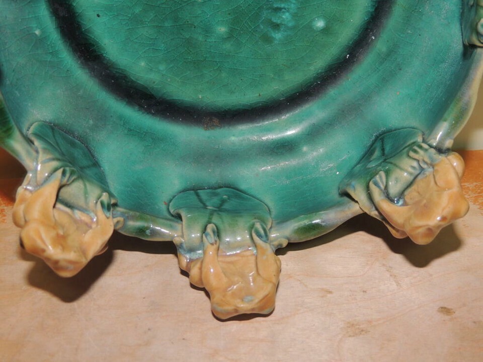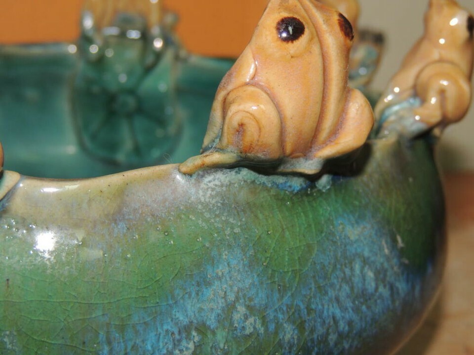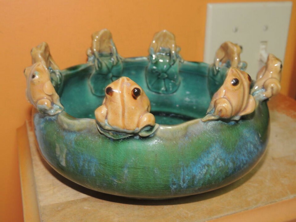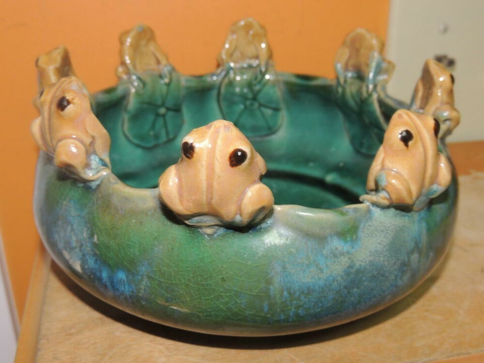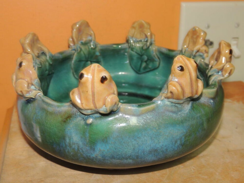 - Frog & Lily Pads 8"x4" Chinese Bowl Planter Polychrome Drip Glaze Majolica Vtg