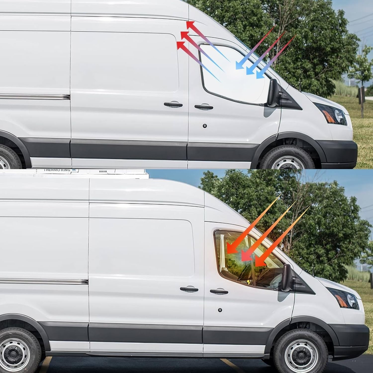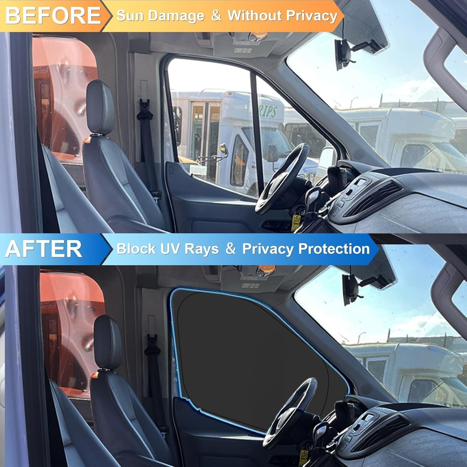Side window shade for 2015 2016 2017 2018 2019 2020 2021 2022 2023 2024 Fo-rd Transit Medium and High Roof Camper Conversions Vans. Not compatible with Fo-rd Transit Connect, older or Low Roof vans. Custom-fit sunshade size to full cover your car front side window and easy installation.