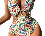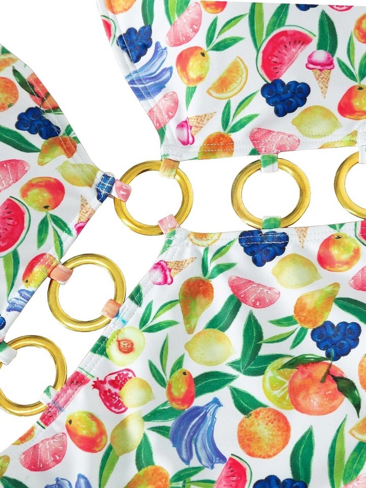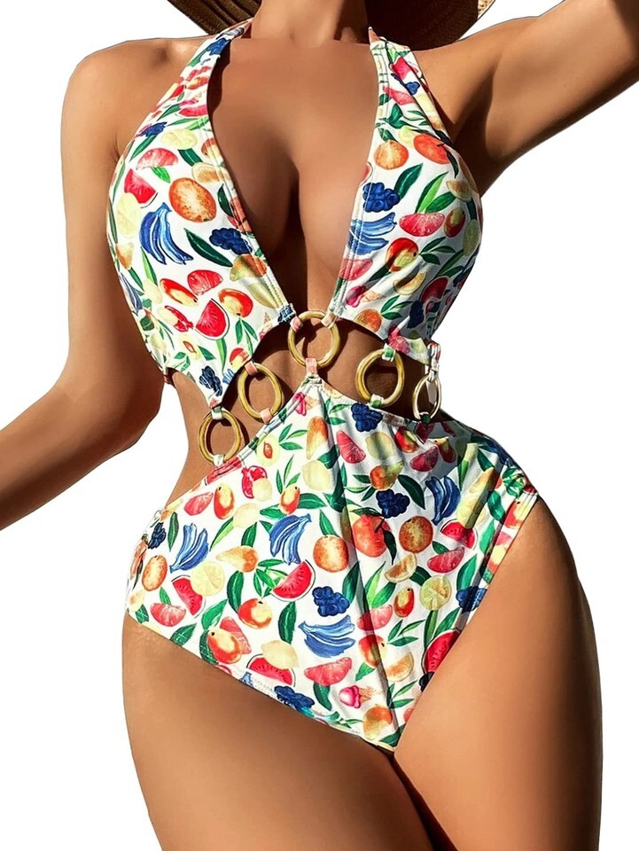 Fruit Print Ring Linked One Piece Swimsuit Cut Out Monokini Multicolor Size S