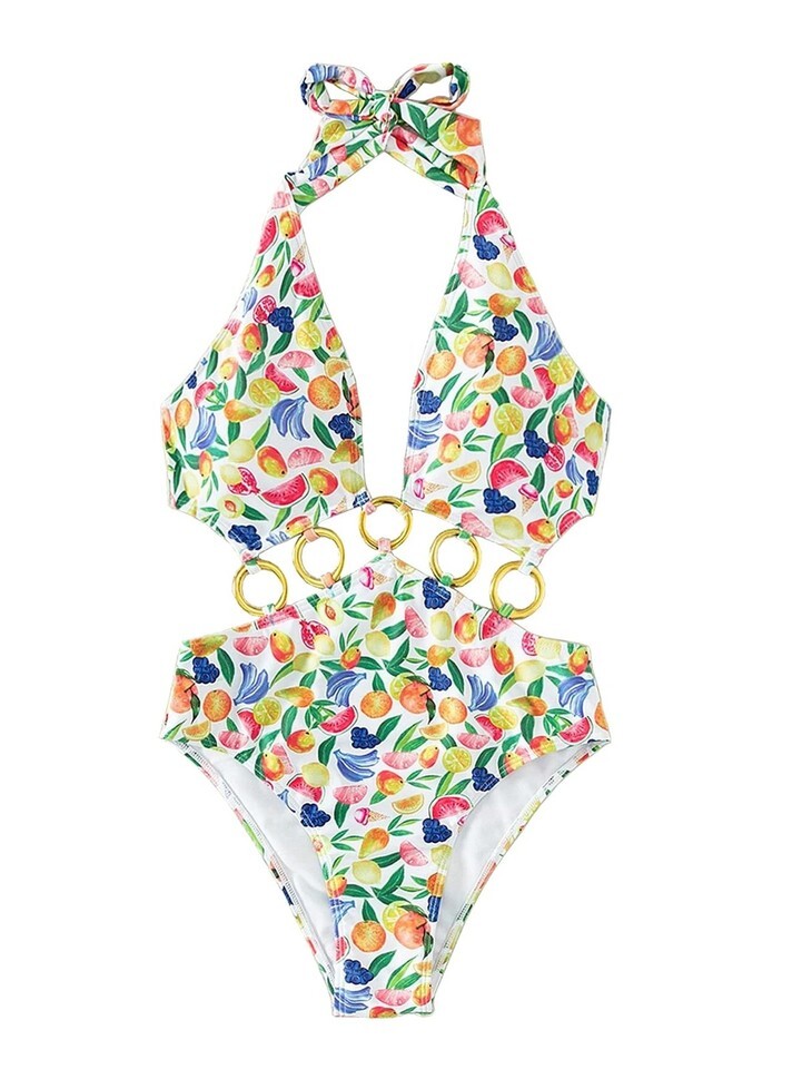 - Fruit Print Ring Linked One Piece Swimsuit Cut Out Monokini Multicolor Size S