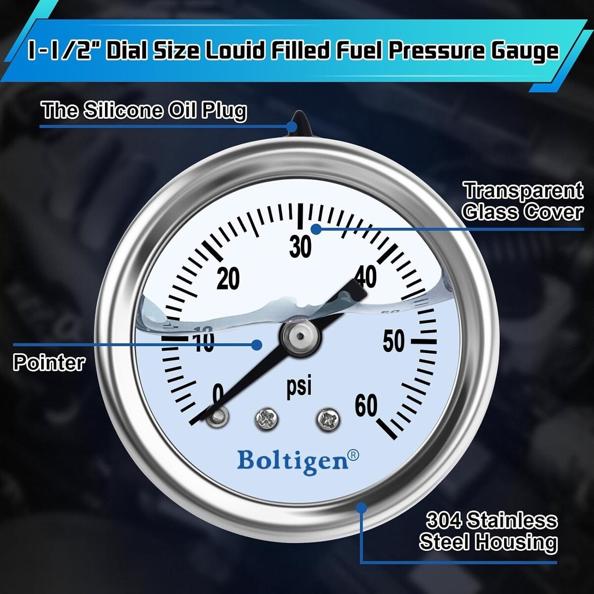 The glycerin-filled pressure gauge with a 1/8 NPT connection, provides precise and reliable readings of fuel pressure up to 60psi. This accuracy ensures proper monitoring and adjustment of fuel system pressure for optimal performance and efficiency.